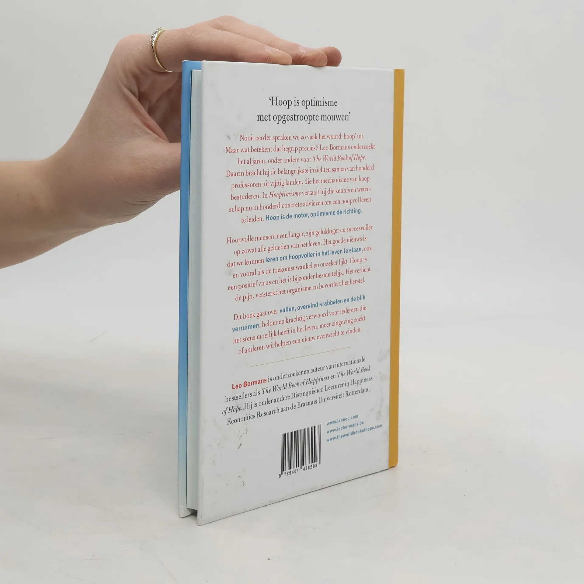 Nooit eerder spraken we zo vaak het woord 'hoop' uit. Maar wat betekent dat begrip precies? Leo Bormans onderzoekt het al jaren, onder andere voor The World Book of Hope . Daarin bracht hij de belangrijkste inzichten samen van honderd professoren uit vijftig landen, die het mechanisme van hoop bestuderen. In Hooptimisme vertaalt hij die kennis en wetenschap nu in honderd concrete adviezen om een hoopvol leven te leiden. Hoop is de motor, optimisme de richting . Hoopvolle mensen leven langer, zijn gelukkiger en succesvoller op zowat alle gebieden van het leven. Het goede nieuws is dat we kunnen leren om hoopvoller in het leven te staan , ook en vooral als de toekomst wankel en onzeker lijkt. Hoop is een positief virus en het is bijzonder besmettelijk. Het verlicht de pijn, versterkt het organisme en bevordert het herstel. Dit boek gaat over vallen, overeind krabbelen en de blik verruimen , helder en krachtig verwoord voor iedereen die het soms moeilijk heeft in het leven, meer zingeving zoekt of anderen wil helpen een nieuw evenwicht te vinden.