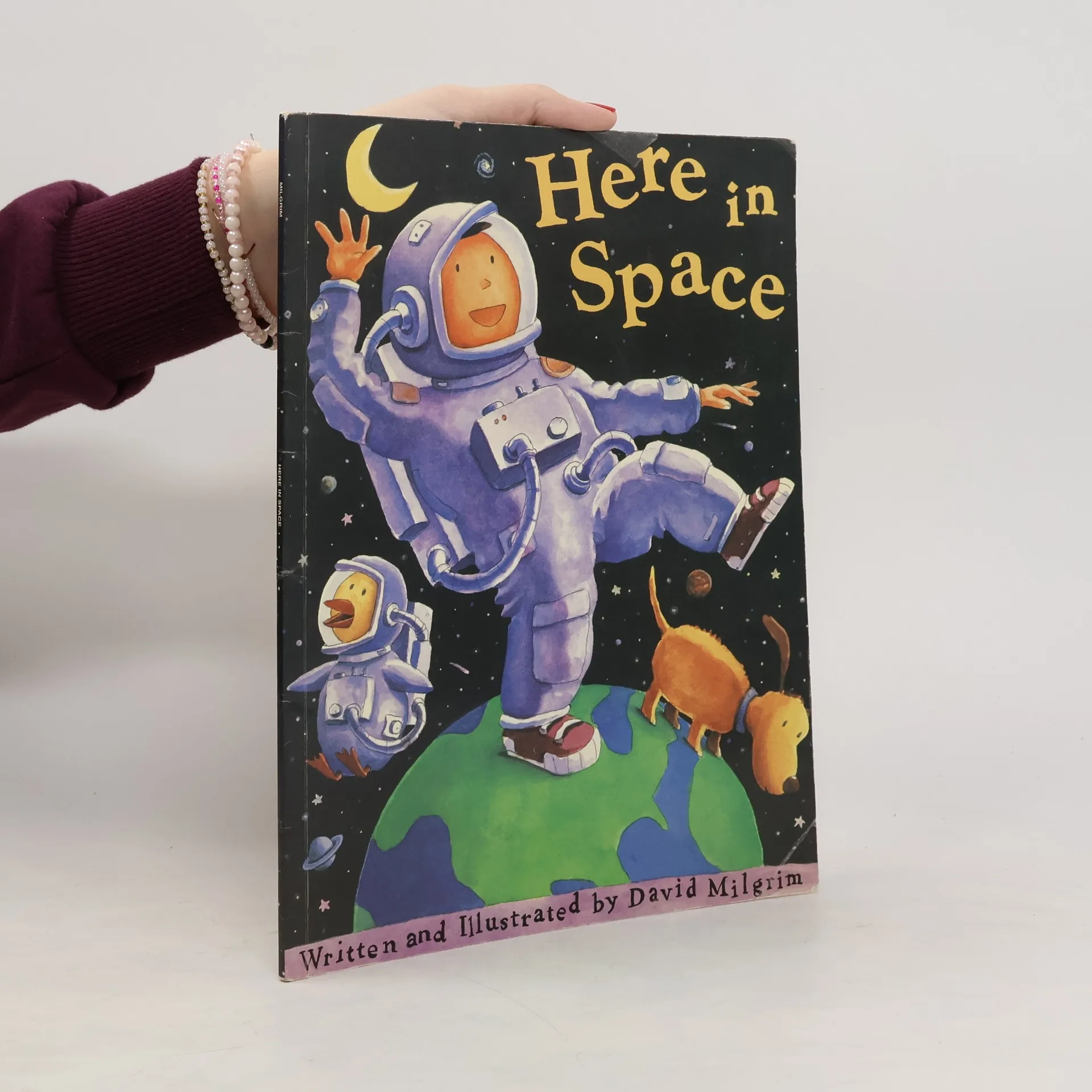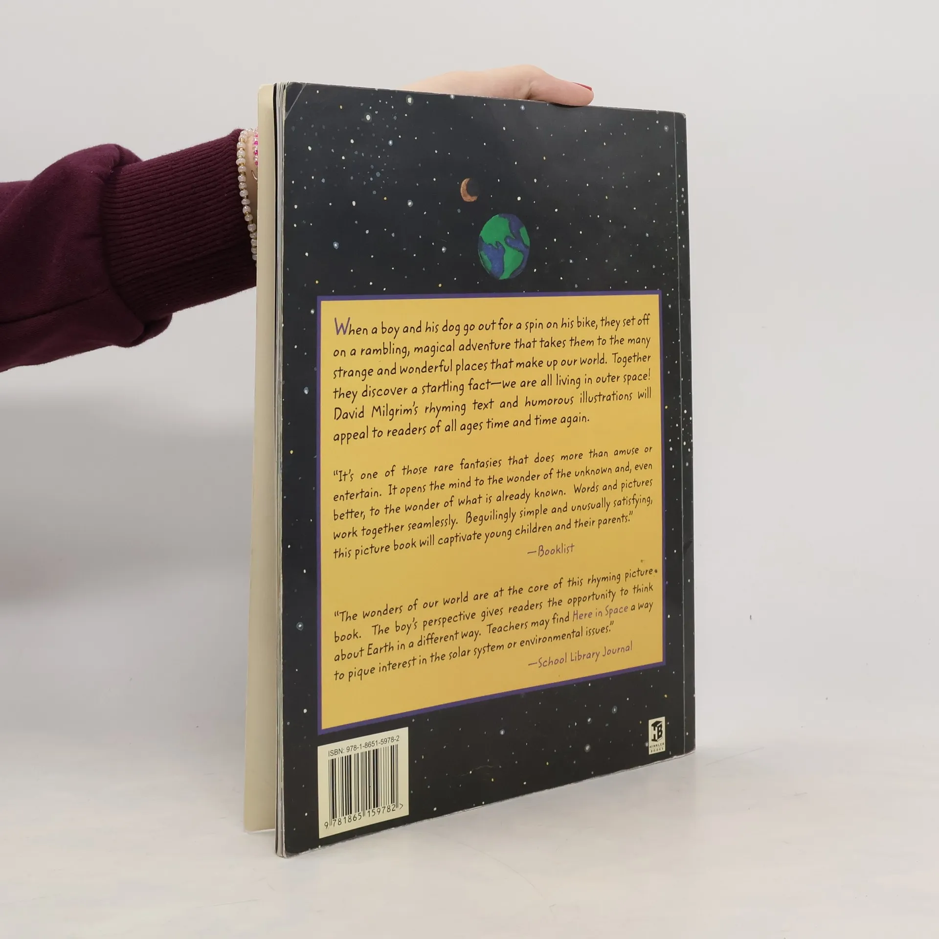 When a boy and his dog set out for a spin on their two-wheeler, young readers embark on a rambling adventure through the remarkable wonders of the world. They discover the startling truth about our home: we are living in outer space! Right here on earth, we are part of the vast mystery of the universe. David Milgrim's whimsical rhyming text and opalescent hues make Here in Space an unforgettable armchair journey.