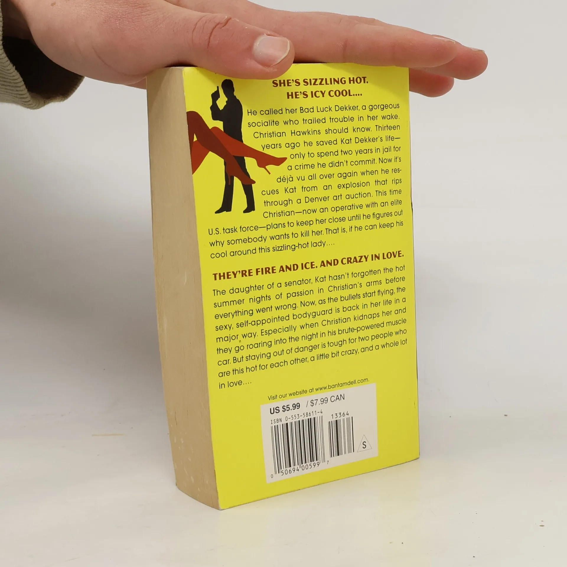 She's sizzling hot...He's icy cool. He called her Bad Luck Dekker, a gorgeous socialite who trailed trouble in her wake. Christian Hawkins should know. Thirteen years ago he saved Kat Dekker’s life—only to spend two years in jail for a crime he didn’t commit. Now it’s déjà vu all over again when he rescues Kat from an explosion that rips through a Denver art auction. This time Christian—now an operative with an elite U.S. task force—plans to keep her close until he figures out why somebody wants to kill her. That is, if he can keep his cool around this sizzling-hot lady.… The daughter of a senator, Kat hasn’t forgotten the hot summer nights of passion in Christian’s arms before everything went wrong. Now, as the bullets start flying, the sexy, self-appointed bodyguard is back in her life in a major way. Especially when Christian kidnaps her and they go roaring into the night in his brute-powered muscle car. But staying out of danger is tough for two people who are this hot for each other, a little bit crazy, and a whole lot in love...