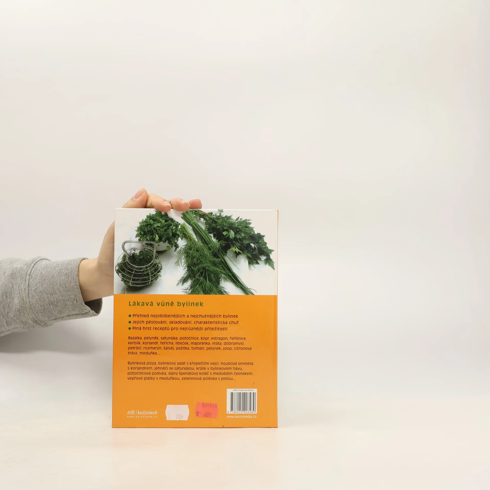 Lákavá vůně bylinek · Přehled nejoblíbenějších a nejchutnějších bylinek · Jejich pěstování, skladování, charakteristická chuť · Plná hrst receptů pro nejrůznější příležitosti Bazalka, pelyněk, saturejka, potočnice, kopr, estragon, řeřišnice, kerblík, koriandr, řeřicha, libeček, majoránka, máta, dobromysl, petržel, rozmarýn, šalvěj, pažitka, tymián, pelyněk, yzop, citronová tráva, meduňka... Bylinková pizza, bylinkový salát s křepelčími vejci, houbová omeleta s koriandrem, jehněčí se saturejkou, králík v bylinkovém hávu, potočnicová polévka, slaný špenátový koláč s medvědím česnekem, vepřové plátky s meduňkou , zeleninová polévka s pistou...