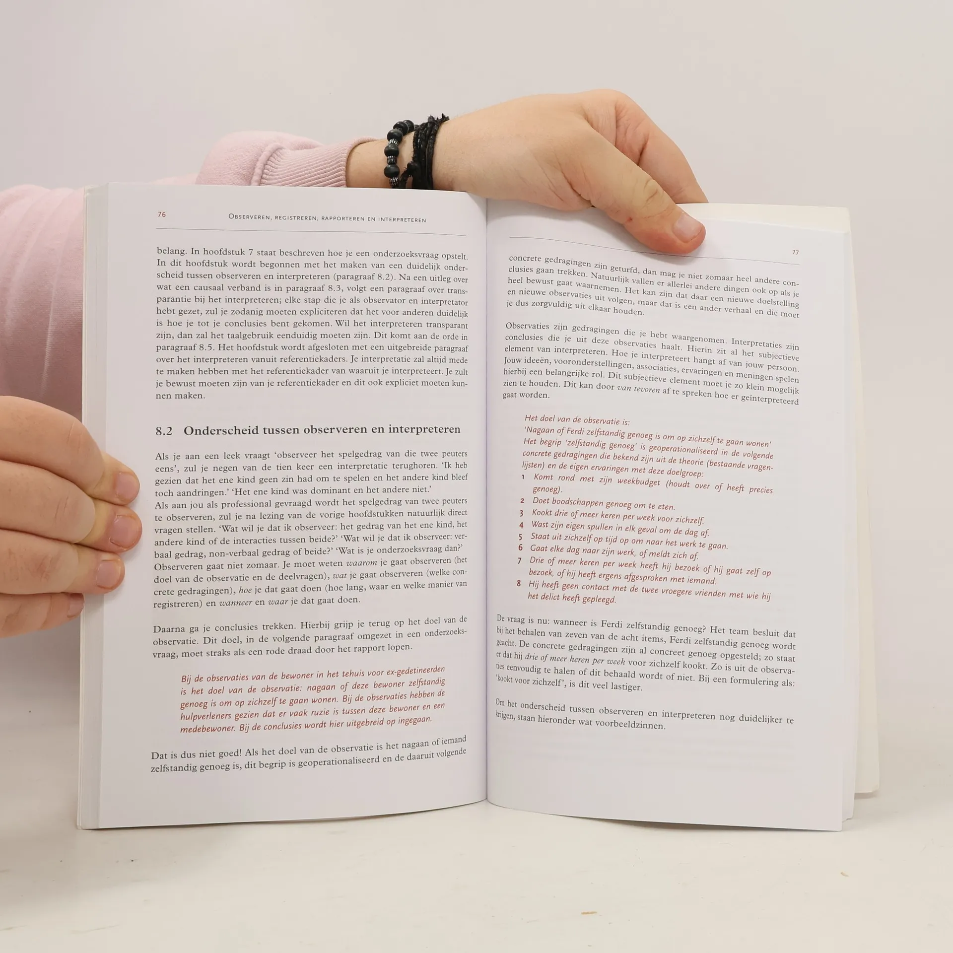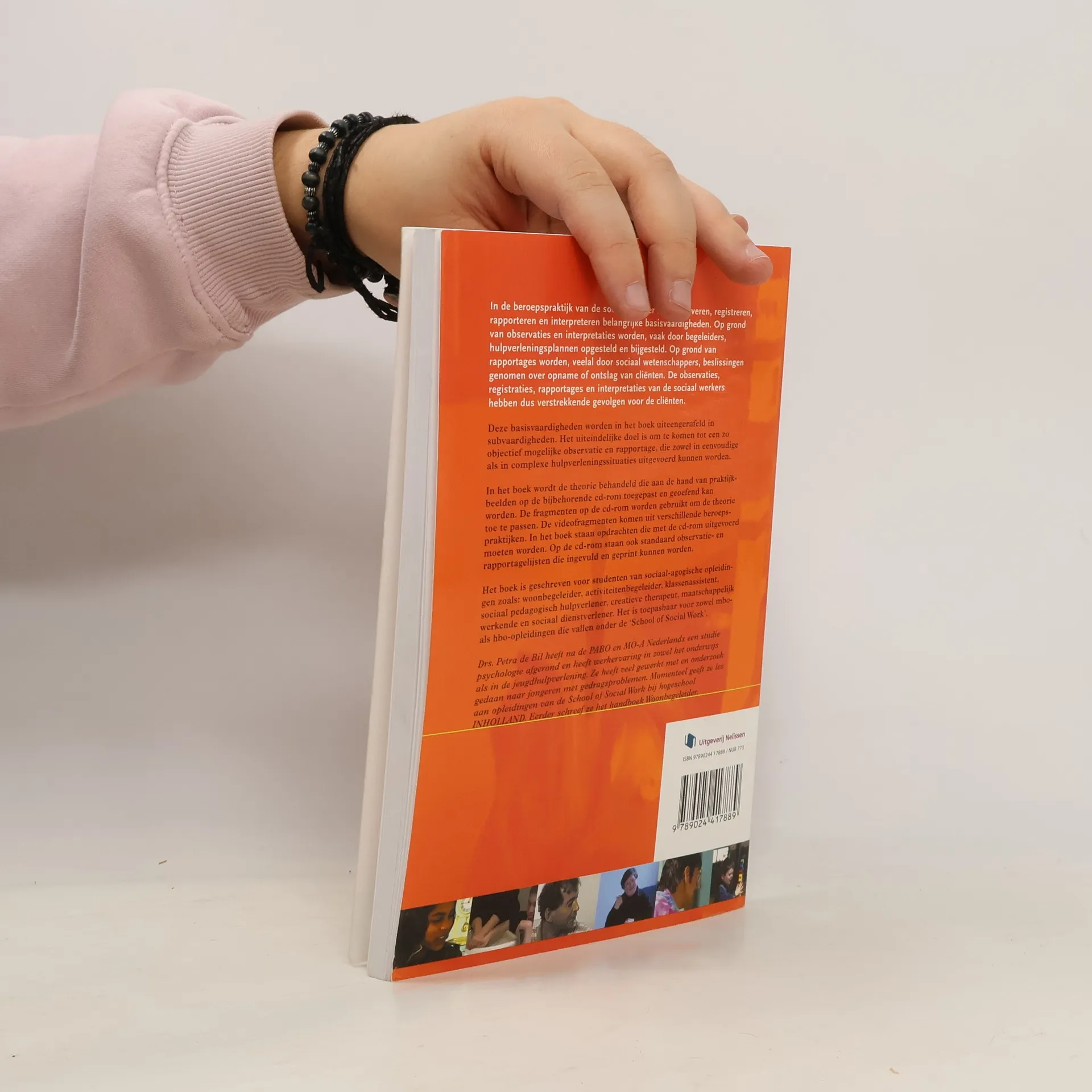 In de beroepspraktijk van de sociaal werker zijn observeren, registreren, rapporteren en interpreteren belangrijke basisvaardigheden. Op grond van observaties en interpretaties worden, vaak door begeleiders, hulpverleningsplannen opgesteld en bijgesteld. Op grond van rapportages worden, veelal door sociaal wetenschappers, beslissingen genomen over opname of ontslag van cliënten. De observaties, registraties, rapportages en interpretaties van de sociaal werkers hebben dus verstrekkende gevolgen voor de cliënten. Deze basisvaardigheden worden in het boek uiteengerafeld in subvaardigheden. Het uiteindelijke doel is om te komen tot een zo objectief mogelijke observatie en rapportage, die zowel in eenvoudige als in complexe hulpverleningssituaties uitgevoerd kunnen worden. In het boek wort de theorie behandeld die aan de hand van praktijkbeelden op de bijbehorende cd-rom toegepast en geoefend kan worden. De fragmenten op de cd-rom worden gebruikt om de theorie toe te passen. De videofragmenten komen uit verschillende beroepspraktijken. In het boek staan opdrachten die met de cd-rom uitgevoerd moeten worden. Op de cd-rom staan ook standaard observatie- en rapportagelijsten die ingevuld en geprint kunnen worden. Het boek is geschreven voor studenten van sociaal-agogische opleidingen zoals: woonbegeleider, activiteitenbegeleider, klassenassistent, sociaal pedagogisch hulpverlener, creatieve therapeut, maatschappelijk werkende en sociaal dienstverlener. Het is toepasbaar voor zowel mbo- als hbo-opleidingen die vallen onder de 'School of Social Work'. Drs. Petra de Bil heeft na de PABO en MO-A Nederlands een studie psychologie afgerond en heeft werkervaring in zowel het onderwijs als in de jeugdhulpverlening. Ze heeft veel gewerkt met en onderzoek gedaan naar jongeren met gedragsproblemen. Momenteel geeft ze les aan opleidingen van de School of Social Work bij hogeschool INHOLLAND. Eerder schreef ze het handboek Woonbegeleider.