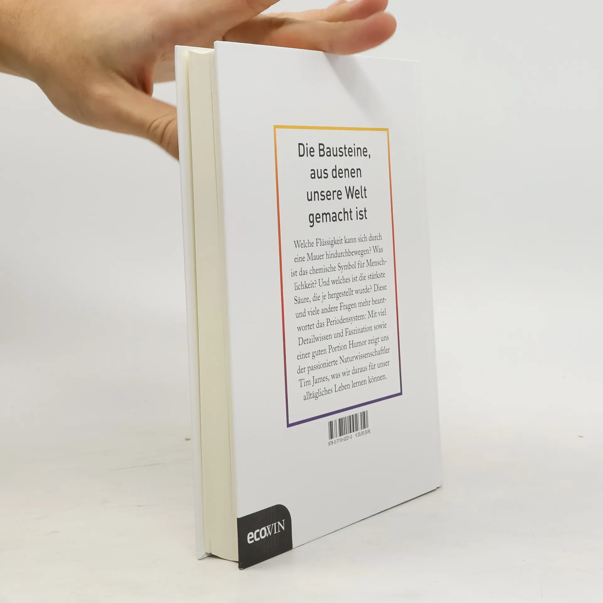 Die Bausteine, aus denen unsere Welt gemacht ist Welche Flüssigkeit kann sich durch eine Mauer hindurchbewegen? Was ist das chemische Symbol für Menschlichkeit? Und welches ist die stärkste Säure, die je hergestellt wurde? Diese und viele andere Fragen mehr beantwortet das Periodensystem: Mit viel Detailwissen und Faszination sowie einer guten Portion Humor zeigt uns der passionierte Naturwissenschaftler Tim James, was wir daraus für unser alltägliches Leben lernen können. Vor rund 14 Milliarden Jahre bestand unser Universum aus einer endlosen Partikelsuppe, die vor sich hin schäumte, viele Male heißer als die Sonne. Als es sich dann ausweitete, kühlte die Suppe glücklicherweise ab und die Partikel festigten sich – die Elemente wurden geboren. Heute gibt es davon 118, und wir sind in der Lage, alle Zutaten, die unsere Welt ausmachen, zu identifizieren. In seinem Buch erzählt der leidenschaftliche Chemie-Experte Tim James die Geschichte des Periodensystems, von seinen Anfängen im Alten Griechenland bis hin zu den Alchemisten der Gegenwart. Auf informative und unterhaltsame Weise zeigt er uns, wie diese abstrakte und scheinbar durcheinandergewürfelte Grafik unser Leben bestimmt und wie die Substanzen darin unsere Welt schaffen.