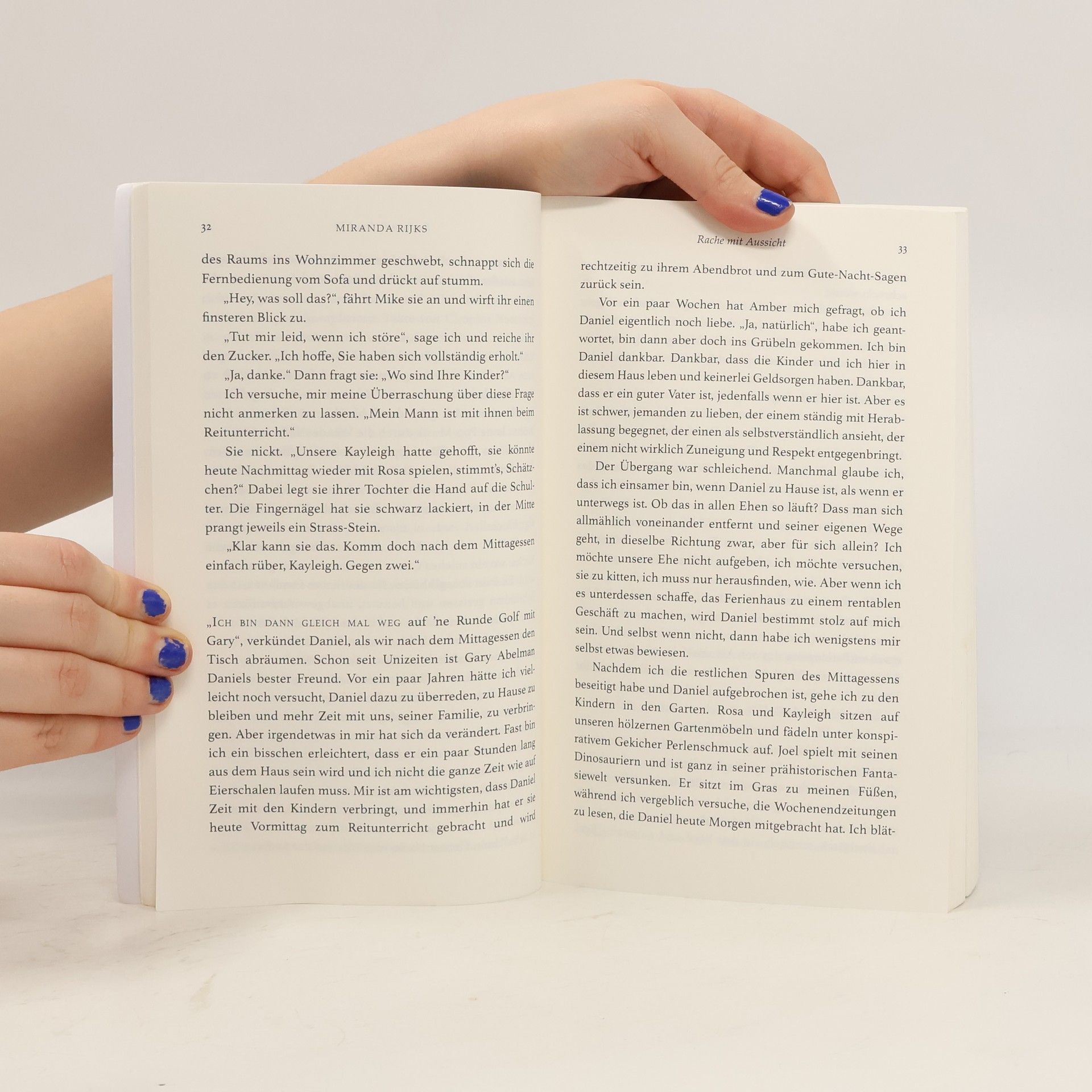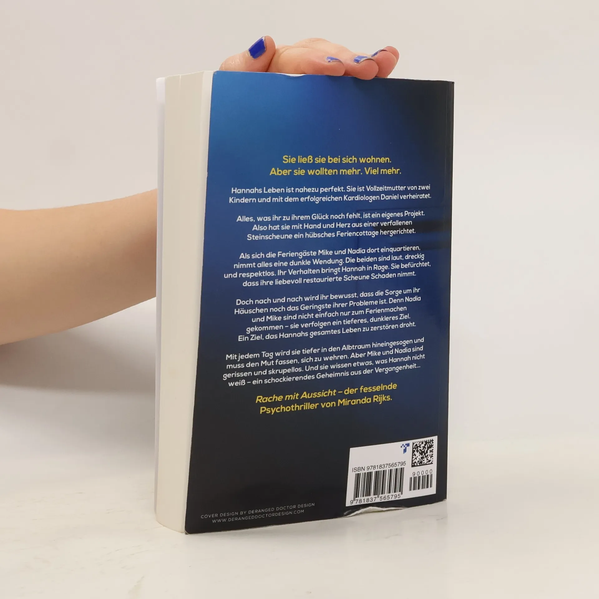 Sie ließ sie bei sich wohnen. Aber sie wollten mehr. Viel mehr.Hannahs Leben ist nahezu perfekt. Sie ist Vollzeitmutter von zwei Kindern und mit dem erfolgreichen Kardiologen Daniel verheiratet.Alles, was ihr zu ihrem Glück noch fehlt, ist ein eigenes Projekt. Also hat sie mit Hand und Herz aus einer verfallenen Steinscheune ein hübsches Feriencottage hergerichtet.Als sich die Feriengäste Mike und Nadia dort einquartieren, nimmt alles eine dunkle Wendung. Die beiden sind laut, dreckig und respektlos. Ihr Verhalten bringt Hannah in Rage. Sie befürchtet, dass ihre liebevoll restaurierte Scheune Schaden nimmt.Doch nach und nach wird ihr bewusst, dass die Sorge um ihr Häuschen noch das Geringste ihrer Probleme ist. Denn Nadia und Mike sind nicht einfach nur zum Ferienmachen gekommen – sie verfolgen ein tieferes, dunkleres Ziel. Ein Ziel, das Hannahs gesamtes Leben zu zerstören droht.Mit jedem Tag wird sie tiefer in den Albtraum hineingesogen und muss den Mut fassen, sich zu wehren. Aber Mike und Nadia sind gerissen und skrupellos. Und sie wissen etwas, was Hannah nicht weiß – ein schockierendes Geheimnis aus der Vergangenheit... Rache mit Aussicht – der fesselnde Psychothriller von Miranda Rijks.