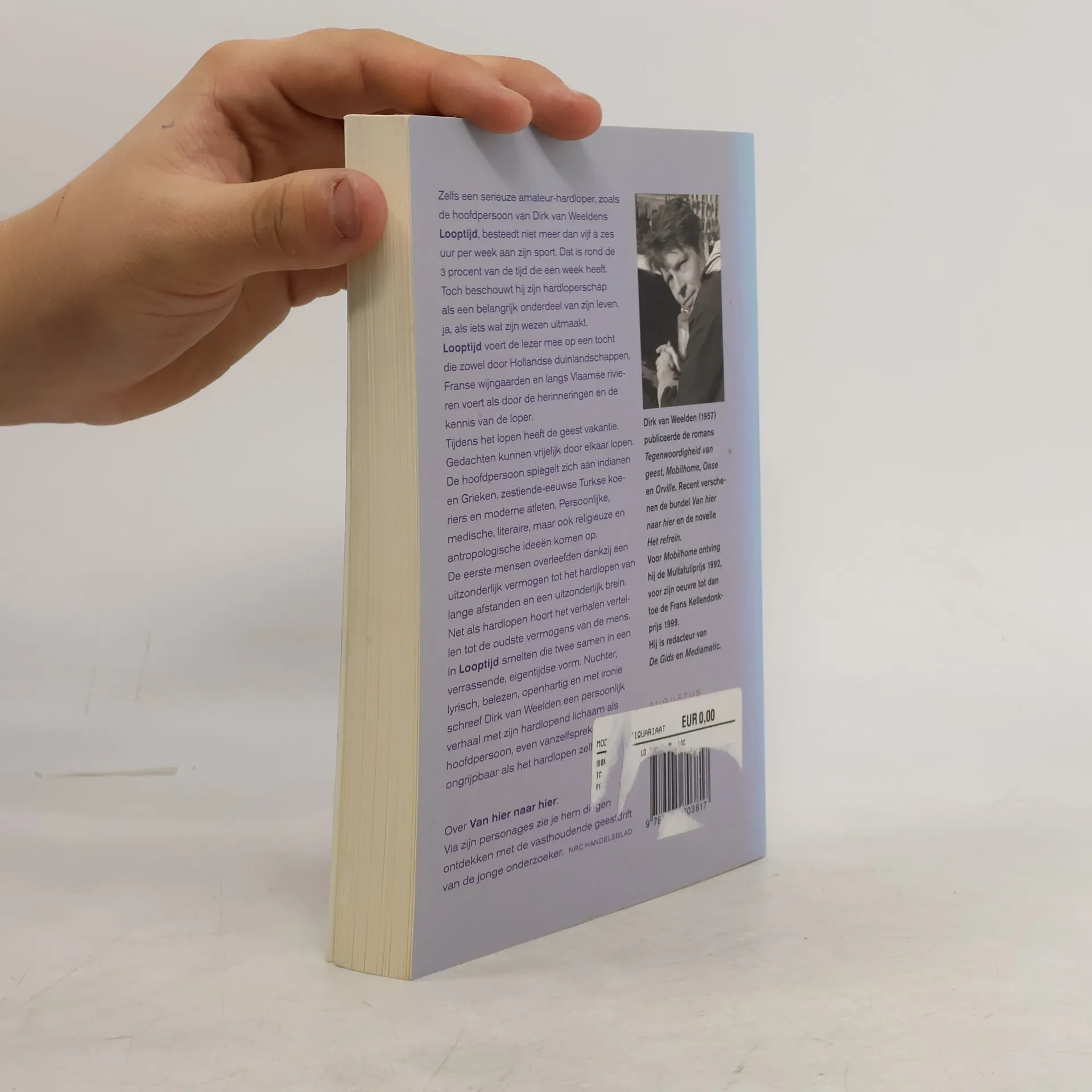 Zelfs een serieuze amateur-hardloper, zoals de hoofdpersoon van Dirk van Weeldens nieuwe boek, besteedt per week niet meer dan vijf à zes uur per week aan zijn sport. Dat is rond de 3 procent van de tijd die een week heeft. Toch beschouwt hij zijn hardloperschap als een belangrijk onderdeel van zijn leven, ja, als iets wat zijn wezen uitmaakt.Looptijd voert de lezer mee op een tocht die zowel door Hollandse duinlandschappen, Franse wijngaarden en langs Vlaamse rivieren voert als door de herinneringen en de kennis van de loper.Tijdens het lopen heeft de geest vakantie. Gedachten kunnen vrijelijk door elkaar lopen. De hoofdpersoon van Looptijd spiegelt zich aan indianen en Grieken, zestiende-eeuwse Turkse koeriers en moderne atleten. Persoonlijke, medische, literaire, maar ook religieuze en antropologische ideeèn komen op.De eerste mensen overleefden dankzij een uitzonderlijk vermogen tot het hardlopen van lange afstanden en een uitzonderlijk brein. Net als hardlopen hoort het verhalen vertellen tot de oudste vermogens van de mens. In Looptijd smelten die twee samen in een verrassende, eigentijdse vorm. Nuchter, lyrisch, belezen, openhartig en met ironie schreef Dirk van Weelden een romanesk dossier met zijn hardlopend lichaam als hoofdpersoon, even vanzelfsprekend als ongrijpbaar als het hardlopen zelf.'