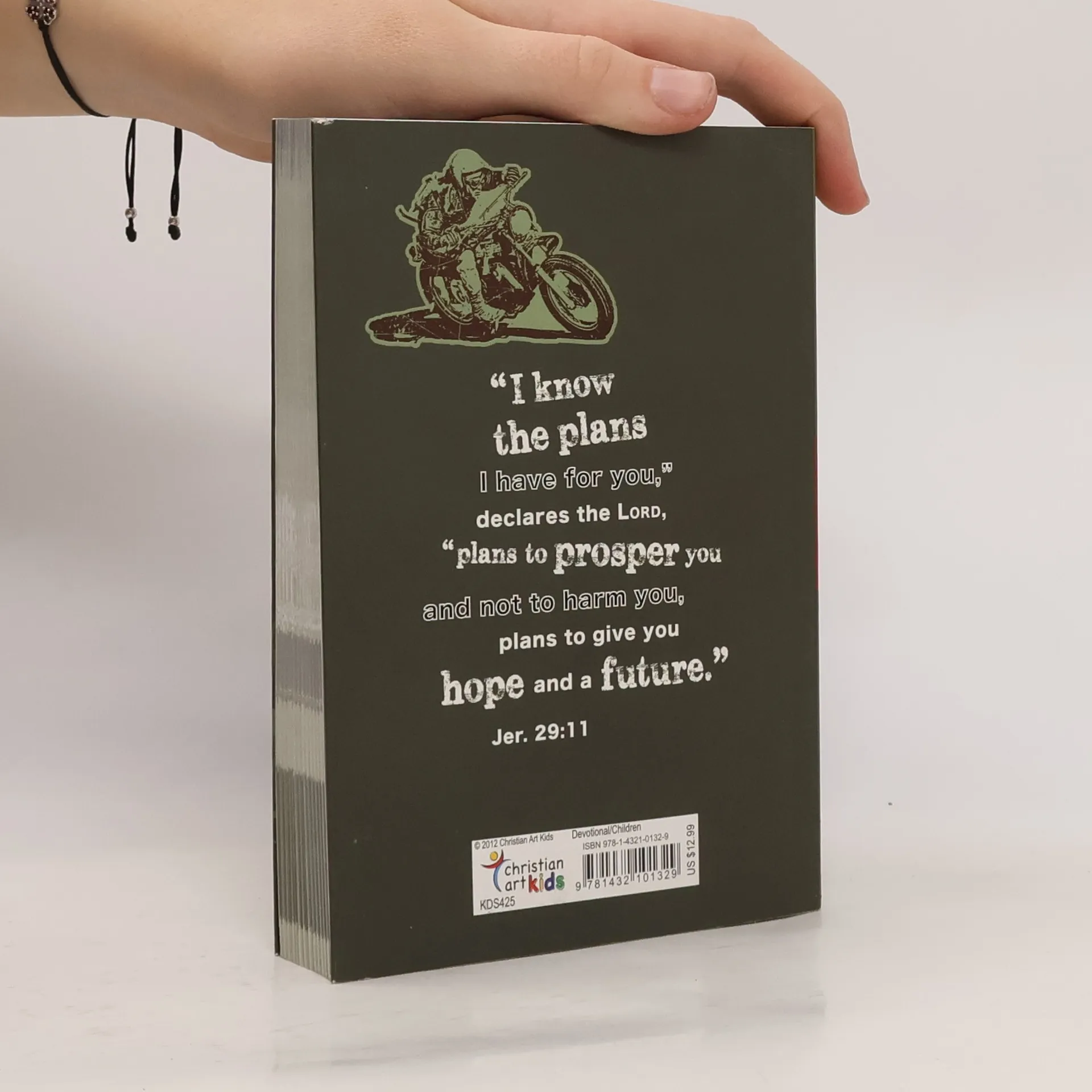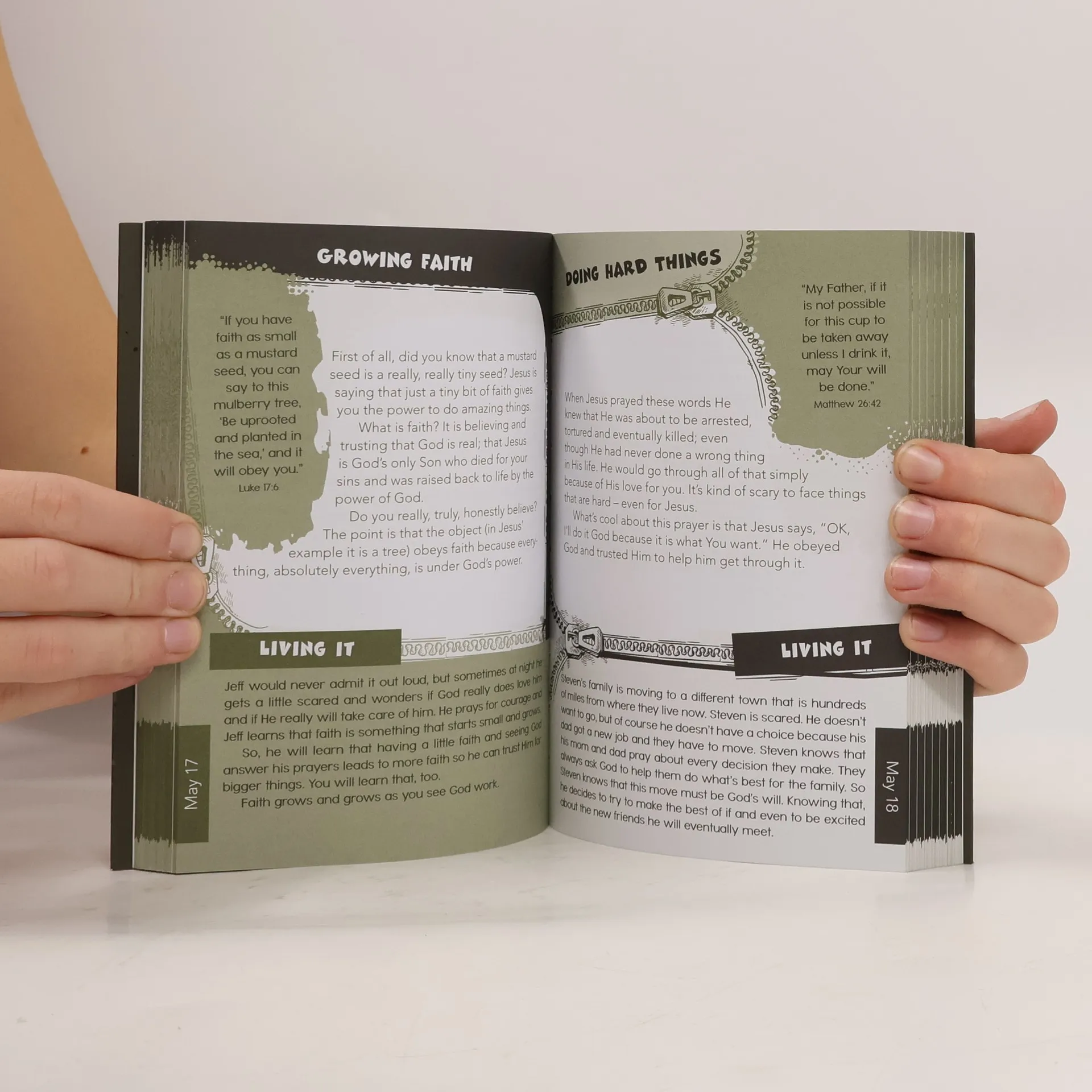 This 5" x 7" devotional book for tween guys has a fun die-cut soft cover with a fold-in flap. It contains 366 devotions with colorful and fun interior layouts. Each devotion contains scripture verses, a devotion and "Living It" (application) section. Ages 8-12