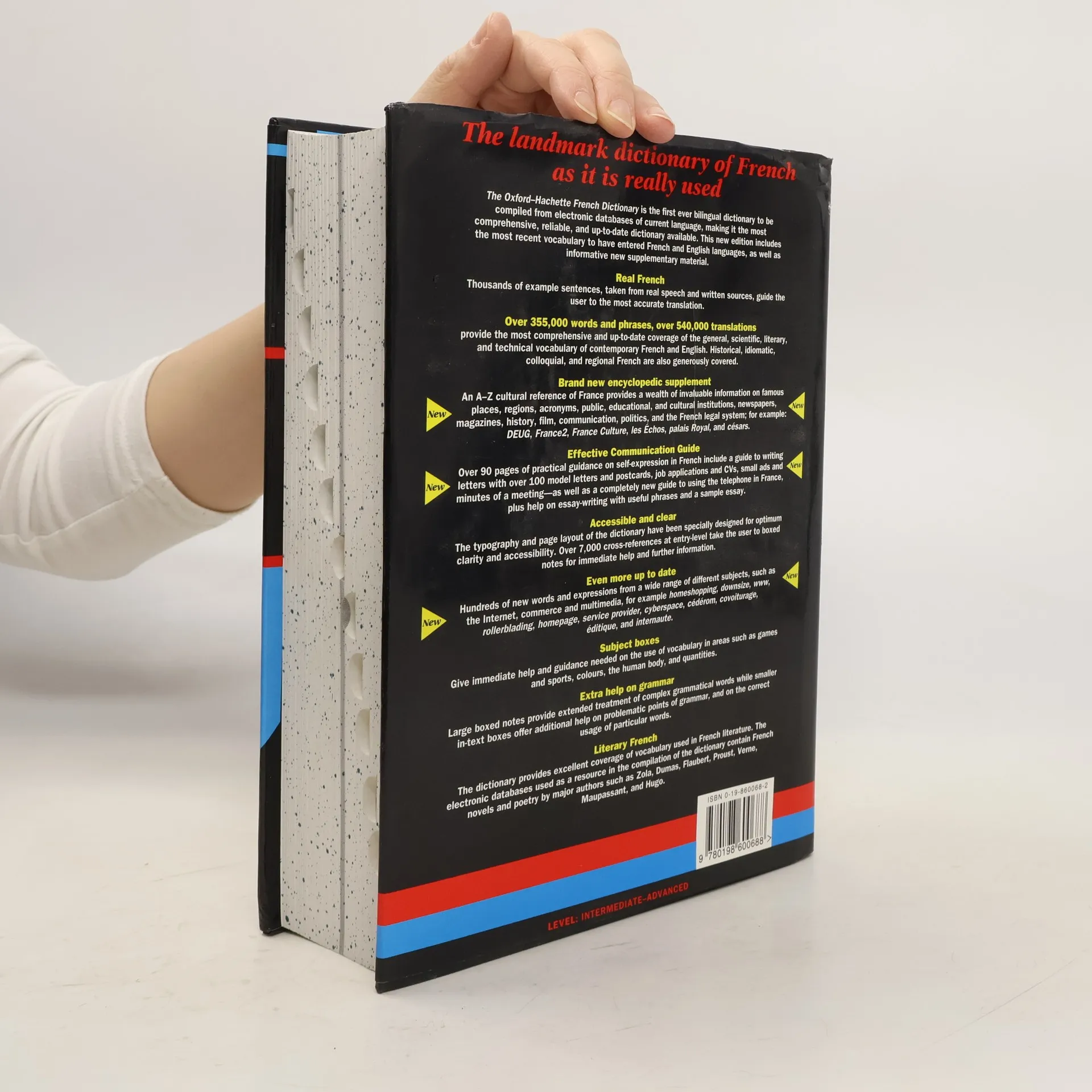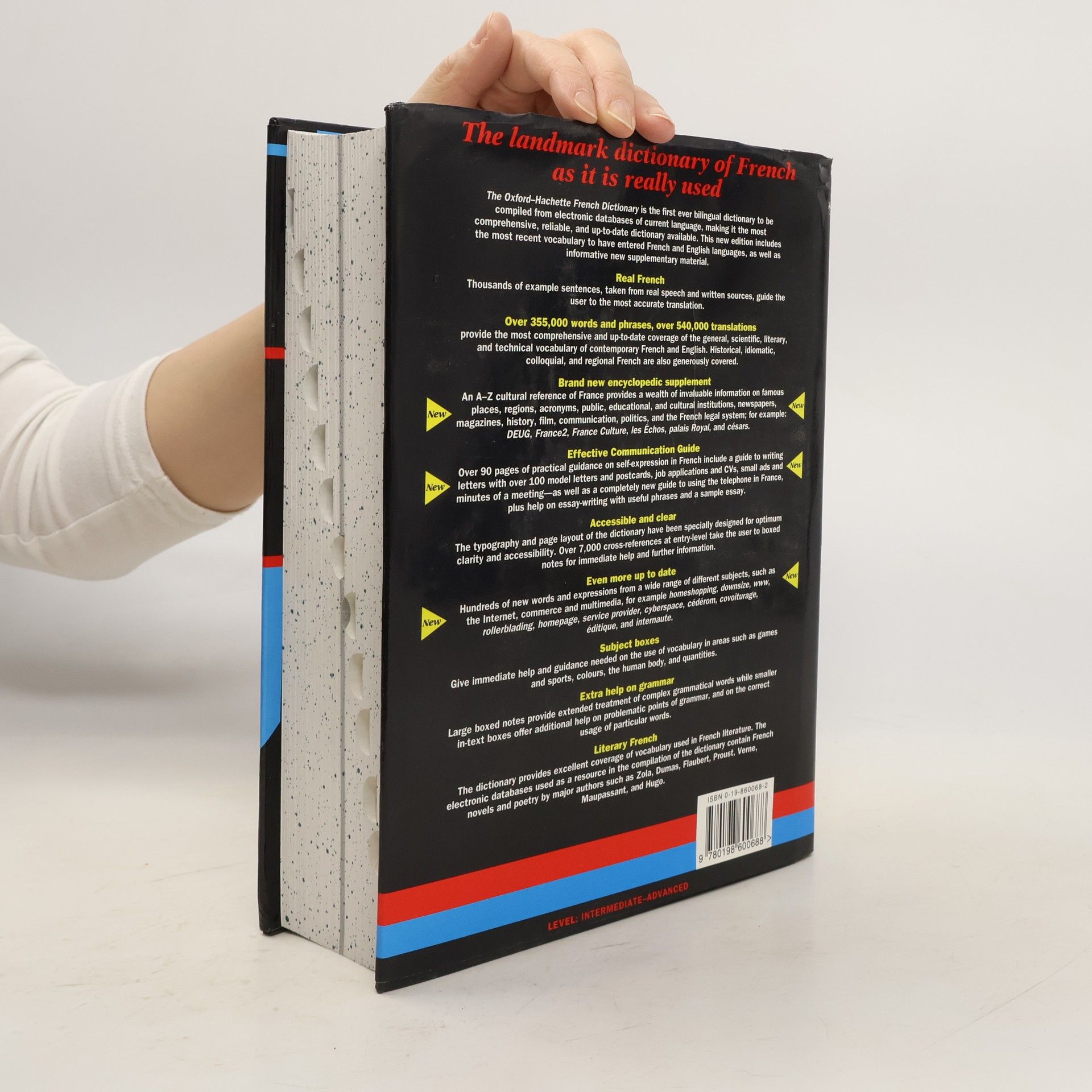 The Oxford-Hachette Franch Dictionary is the first bilingual dictionary to be compiled entirely from electronic databases of current language, making it the most comprehensive, reliable, and up-to-date reference available. The new edition provides the most recent vocabulary for both French and English, as well as additional new supplementary material, most notably, a new encyclopedic supplement that provides a wealth of information on French society and culture, including famous places, regions, acronyms, institutions, film, politics, much more. Of course, the Hachette still provides the most comprehensive coverage available of the general, scientific, and technical vocabulary of contemporary French and English--with 355,000 words and phrases and over 540,000 translations. As an aid to students of French literature, the dictionary provides excellent coverage of vocabulary used by writers such as Zola, Dumas, Proust, and Hugo. There is also over 90 pages of practical guidance for those who plan to reside in France, including over 100 model letters and postcards, help in writing job applications and CVs, and a completely new section on using the telephone in France. With more words and phrases than any other single-volume French dictionary, plus special features designed to help both students and travelers, the new edition of The Oxford Hachette French Dictionary remains the first choice in bilingual dictionaries.