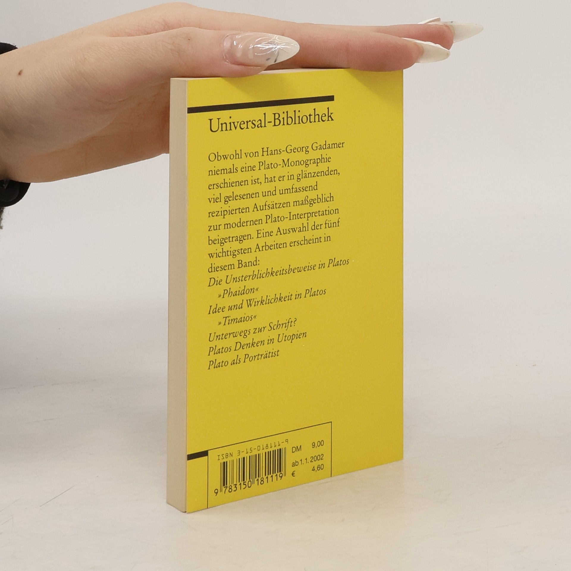 Hans-Georg Gadamer hat in glänzenden, viel gelesenen und umfassend rezipierten Aufsätzen maßgeblich zur modernen Plato-Interpretation beigetragen. Fünf davon hat der Philosoph in seinem 101. Lebensjahr für diesen Band ausgewählt und mit einem Vorwort versehen: Die Unsterblichkeitsbeweise in Platos „Phaidon“ - Idee und Wirklichkeit in Platos „Timaios“ - Unterwegs zur Schrift? - Platos Denken in Utopien - Plato als Porträtist.