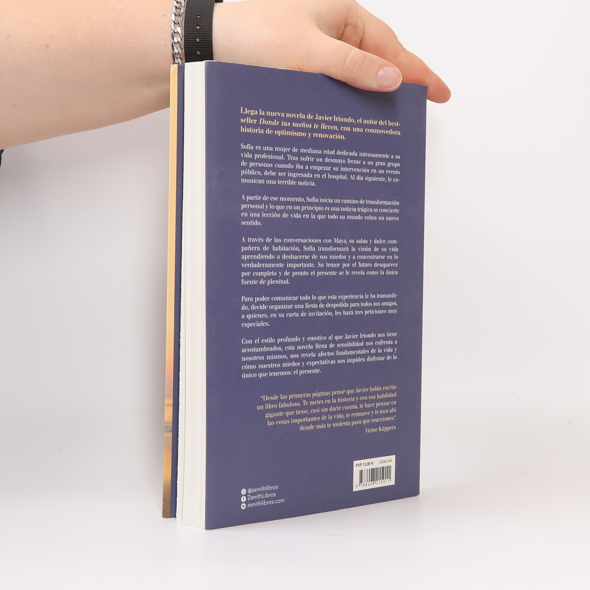 A Sofía, una mujer de mediana edad completamente volcada en su vida profesional, le comunican que le quedan pocos meses de vida. A partir de ese momento, Sofía inicia un camino de transformación personal y lo que en un principio es una noticia trágica se convierte en una lección de vida en la que todo su mundo cobra un nuevo sentido. A través de las conversaciones con Maya, su sabia y dulce compañera de habitación, Sofía aprenderá a deshacerse de sus miedos y a concentrarse en lo verdaderamente importante. Su temor por el futuro desaparece por completo y de pronto el presente se le revela como la única fuente de plenitud. Para poder comunicar todo lo que esta experiencia le ha transmitido, decide organizar una fiesta de despedida para todos sus amigos, a quienes en su carta de invitación les hará tres peticiones muy especiales. Con el estilo profundo y emotivo al que Javier Iriondo nos tiene acostumbrados, esta novela llena de sensibilidad nos enfrenta a nosotros mismos y nos revela cómo nuestros miedos y expectativas nos impiden disfrutar de lo único que tenemos: el tiempo de nuestra vida.
