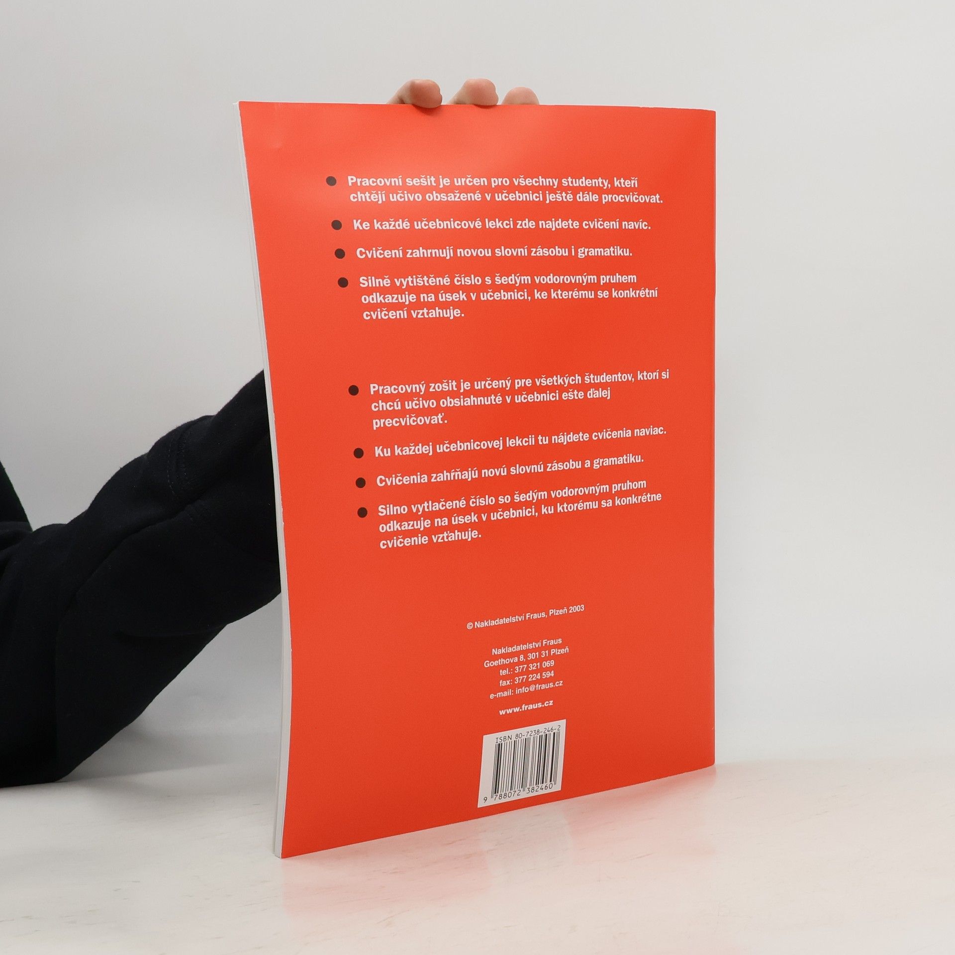 pracovní sešit je určen pro všechny studenty, kteří chtějí učivo obsažené v učebnici ještě dále procvičovat ke každé učebnicové lekci zde najdete cvičení navíc cvičení zahrnují novou slovní zásobusilně vytištěné číslo s šedým vodorovným pruhem odkazuje na úsek v učebnici, ke kterému se konkrétní cvičení vztahuje