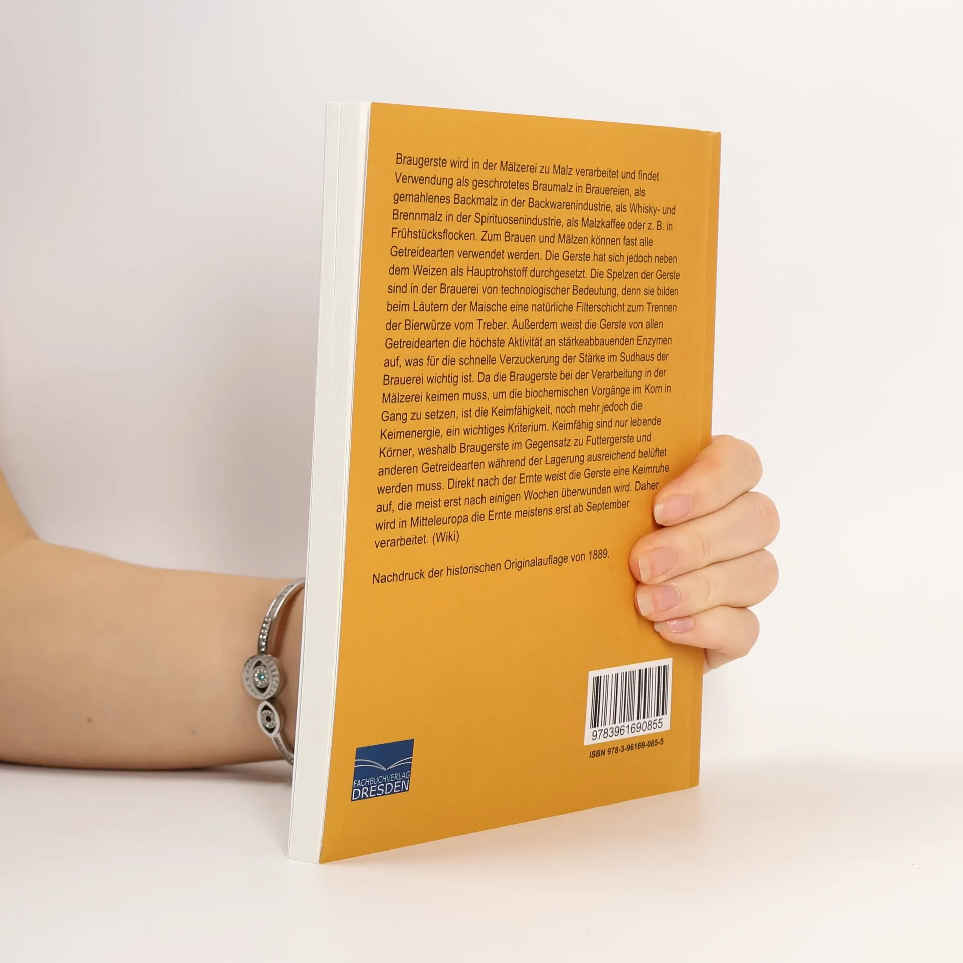 Braugerste wird in der Mälzerei zu Malz verarbeitet und findet Verwendung als geschrotetes Braumalz in Brauereien, als gemahlenes Backmalz in der Backwarenindustrie, als Whisky- und Brennmalz in der Spirituosenindustrie, als Malzkaffee oder z. B. in Frühstücksflocken. Zum Brauen und Mälzen können fast alle Getreidearten verwendet werden. Die Gerste hat sich jedoch neben dem Weizen als Hauptrohstoff durchgesetzt. Die Spelzen der Gerste sind in der Brauerei von technologischer Bedeutung, denn sie bilden beim Läutern der Maische eine natürliche Filterschicht zum Trennen der Bierwürze vom Treber. Außerdem weist die Gerste von allen Getreidearten die höchste Aktivität an stärkeabbauenden Enzymen auf, was für die schnelle Verzuckerung der Stärke im Sudhaus der Brauerei wichtig ist. Da die Braugerste bei der Verarbeitung in der Mälzerei keimen muss, um die biochemischen Vorgänge im Korn in Gang zu setzen, ist die Keimfähigkeit, noch mehr jedoch die Keimenergie, ein wichtiges Kriterium. Keimfähig sind nur lebende Körner, weshalb Braugerste im Gegensatz zu Futtergerste und anderen Getreidearten während der Lagerung ausreichend belüftet werden muss. Direkt nach der Ernte weist die Gerste eine Keimruhe auf, die meist erst nach einigen Wochen überwunden wird. Daher wird in Mitteleuropa die Ernte meistens erst ab September verarbeitet. (Wiki)Nachdruck der historischen Originalauflage von 1889.