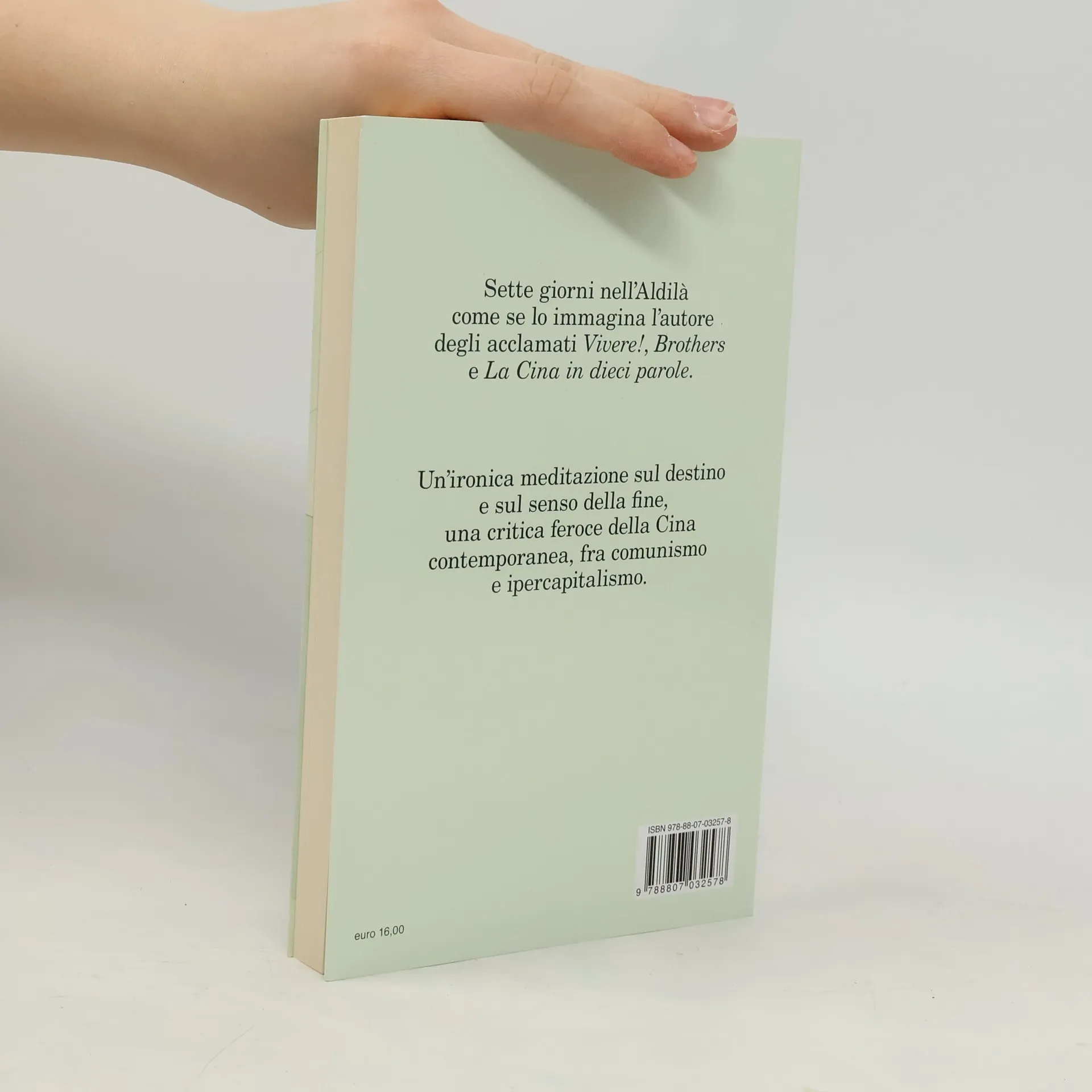 Un’ironica meditazione sul destino e sul senso della fine, una critica feroce della Cina contemporanea, fra comunismo e ipercapitalismo. Yang Fei esce di casa una mattina e trova una fitta nebbia mista a una strana neve luminosa: è in ritardo per la sua cremazione. Inizia così il viaggio nell’Aldilà di un uomo vissuto, troppo brevemente, nella Cina del capitalismo socialista e delle sue aberranti contraddizioni. In un’avventura di sette giorni, il protagonista incontrerà persone care smarrite da tempo, imparando nuove cose su di loro e su se stesso. Conoscenti e sconosciuti gli racconteranno poi la propria storia nell’inferno vero, l’Aldiquà: demolizioni forzate, corruzione, tangenti, feti gettati nel fiume come rifiuti, miriadi di poveracci che pullulano in bunker sotterranei come formiche, traffico di organi, consumismo sfrenato… La morte livella le diseguaglianze, svelando l’essenziale, e i cittadini di questa necropoli soave uscita dalla penna di Yu Hua ci insegnano tutta la semplicità dell’amore.
