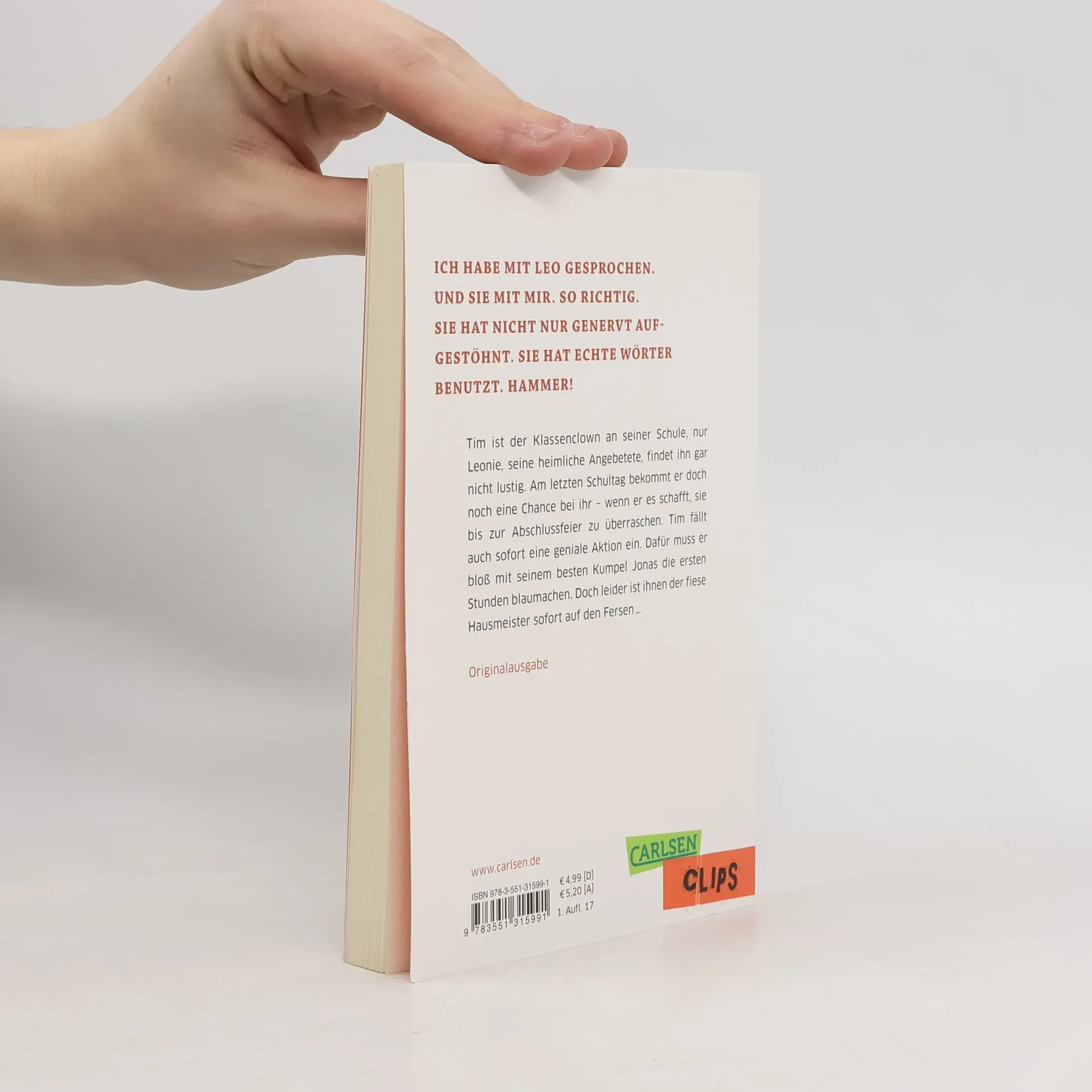 Tim ist als Klassenclown bei seinen Mitschülern überaus beliebt. Nur bei einer nicht: Leonie. Doch Tim mag Leonie, sogar sehr. Als er bemerkt, wie sich der Schönling Lukas am letzten Schultag vor den Sommerferien an Leonie heranmacht, muss er sofort handeln. Mit seinem besten Kumpel Jonas schleicht er sich aus der Schule. Bis zum Mittag will er zurück sein, um Leonies Herz mit einer spektakulären Aktion zu erobern. Wenn ihm dabei nur nicht der fiese Hausmeister auf den Fersen wäre, der alles tun würde, damit Tim von der Schule fliegt!