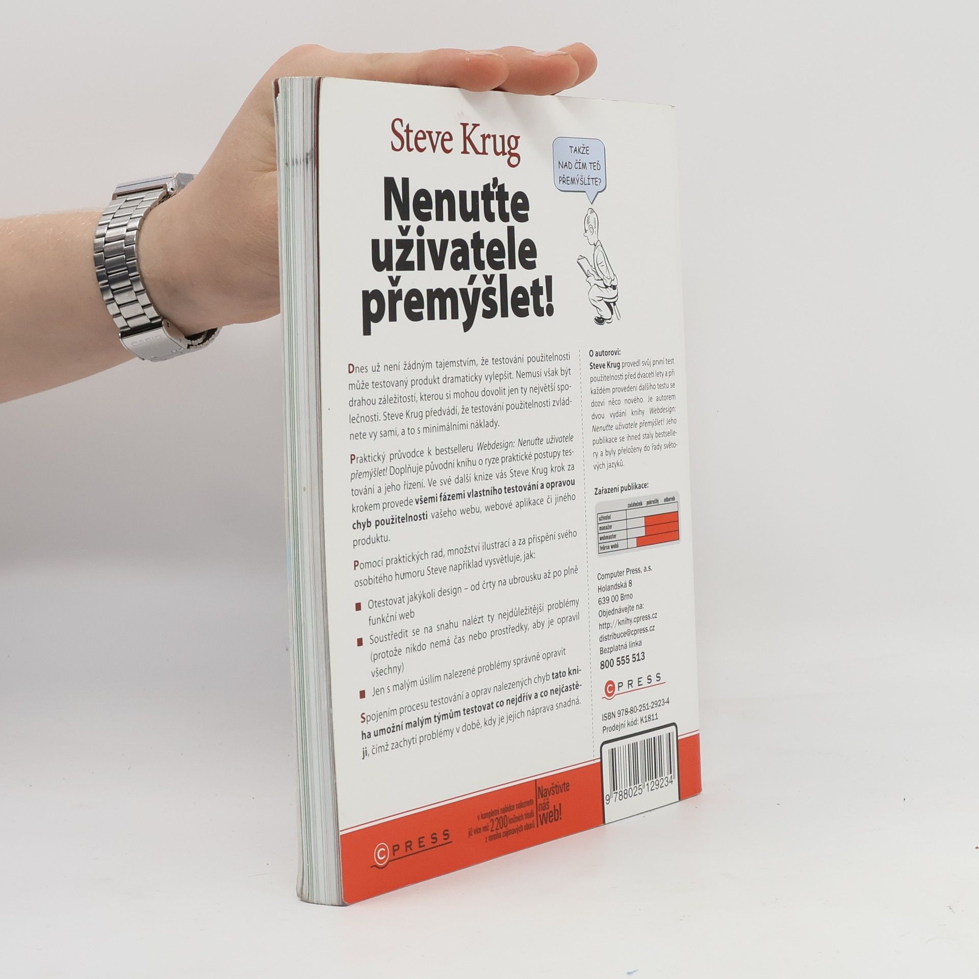 Testování použitelnosti může výrazně zlepšit kvalitu produktu a nemusí být drahé. Steve Krug ukazuje, že si testování můžete provést sami s minimálními náklady. Tento praktický průvodce doplňuje jeho bestseller o konkrétní postupy testování a jeho řízení. Krug vás provede všemi fázemi testování a opravou chyb použitelnosti vašeho webu, aplikace či jiného produktu. S množstvím ilustrací a osobitým humorem vysvětluje, jak otestovat jakýkoli design – od skici na ubrousku po plně funkční web. Zaměřuje se na identifikaci nejdůležitějších problémů, protože nikdo nemá čas nebo prostředky na opravu všech. S minimálním úsilím můžete správně opravit nalezené problémy. Kombinací procesu testování a oprav kniha umožňuje malým týmům testovat co nejdříve a co nejčastěji, což pomáhá zachytit problémy v době, kdy je jejich náprava snadná. Čtenáři najdou všechny materiály k publikaci na uvedené webové adrese. Steve Krug má dvacetiletou zkušenost s testováním použitelnosti a při každém testu se dozvídá něco nového. Je autorem dvou vydání bestselleru, který byl přeložen do mnoha jazyků.