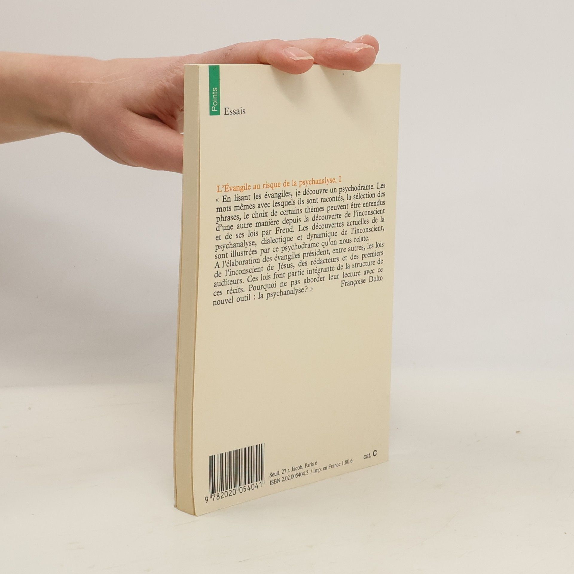 Essais"En lisant les évangiles, je découvre un psychodrame. Les mots mêmes avec lesquels ils sont racontés, la sélection des phrases, le choix de certains thèmes peuvent être entendus d'une autre manière depuis la découverte de l'inconscient et de ses lois par Freud. Les découvertes actuelles de la psychanalyse, dialectique et dynamique de l'inconscient, sont illustrées par ce psychodrame qu'on nous relate.A l'élaboration des évangiles président, entre autres, les lois de l'inconscient de Jésus, des rédacteurs et des premiers auditeurs. Ces lois font partie intégrante de la structure de ces récits. Pourquoi ne pas aborder leur lecture avec ce nouvel outil : la psychanalyse ?" Françoise Dolto