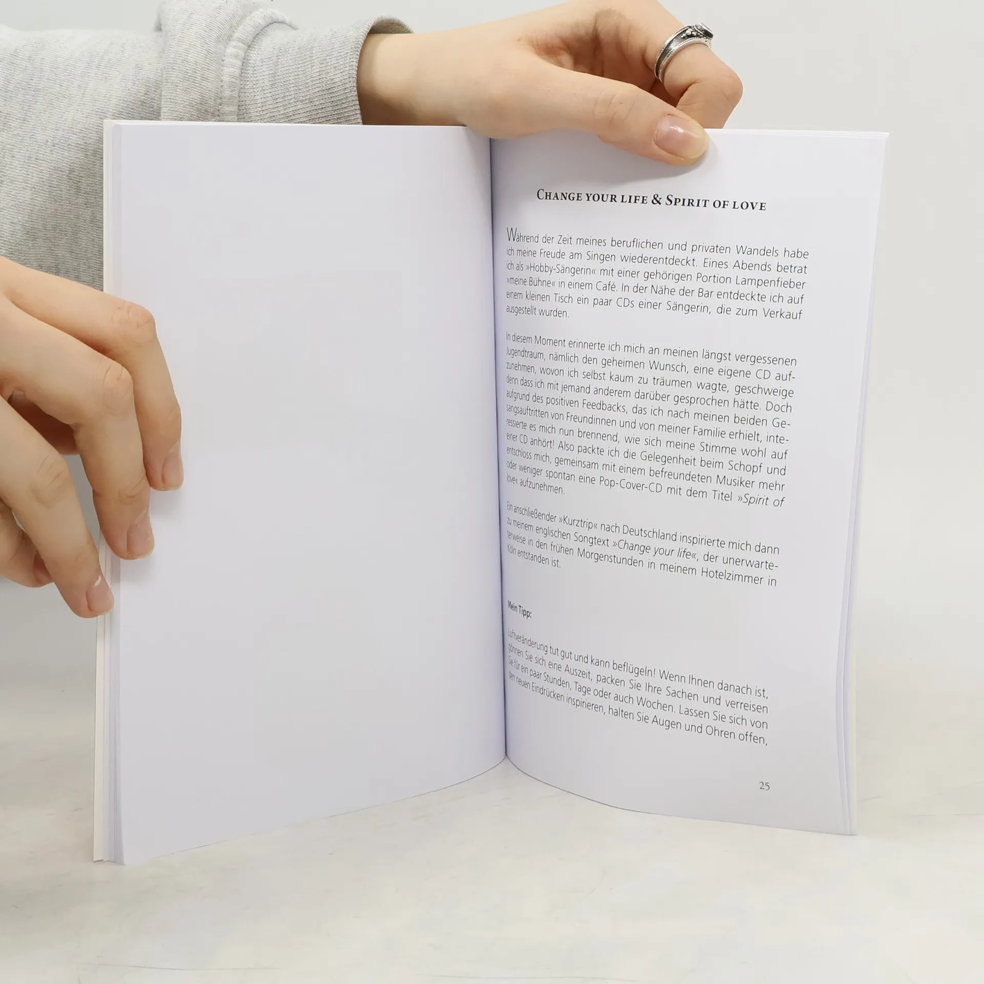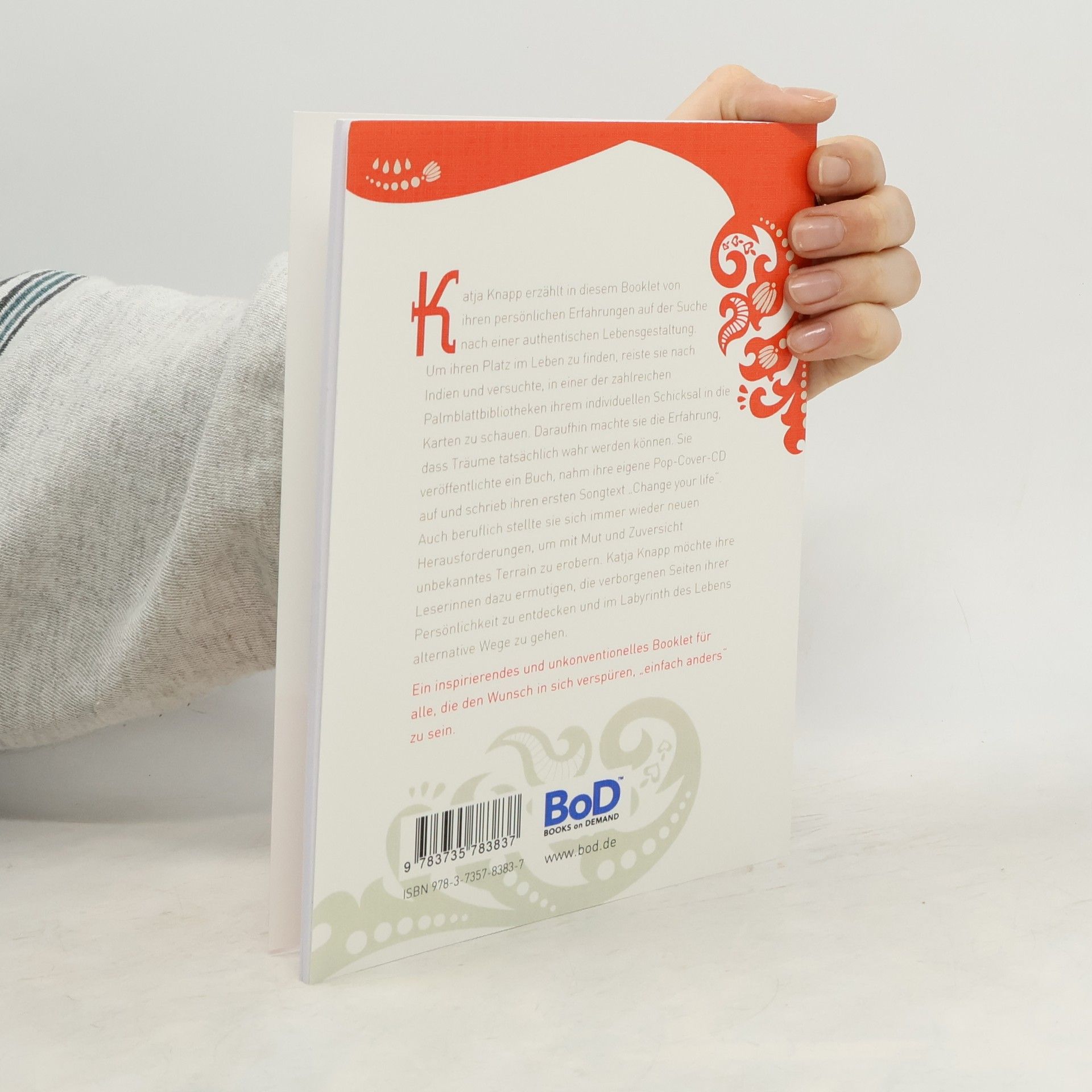 Katja Knapp erzählt in diesem Booklet von ihren persönlichen Erfahrungen auf der Suche nach einer authentischen Lebensgestaltung. Um ihren Platz im Leben zu finden, reiste sie nach Indien und versuchte, in einer der zahlreichen Palmblattbibliotheken ihrem individuellen Schicksal in die Karten zu schauen. Daraufhin machte sie die Erfahrung, dass Träume tatsächlich wahr werden können. Sie veröffentlichte ein Buch, nahm ihre eigene Pop-Cover-CD auf und schrieb ihren ersten Songtext „Change your life". Auch beruflich stellte sie sich immer wieder neuen Herausforderungen, um mit Mut und Zuversicht unbekanntes Terrain zu erobern. Katja Knapp möchte ihre Leserinnen dazu ermutigen, die verborgenen Seiten ihrer Persönlichkeit zu entdecken und im Labyrinth des Lebens alternative Wege zu gehen. Ein inspirierendes und unkonventionelles Booklet für alle, die den Wunsch in sich verspüren, „einfach anders" zu sein.