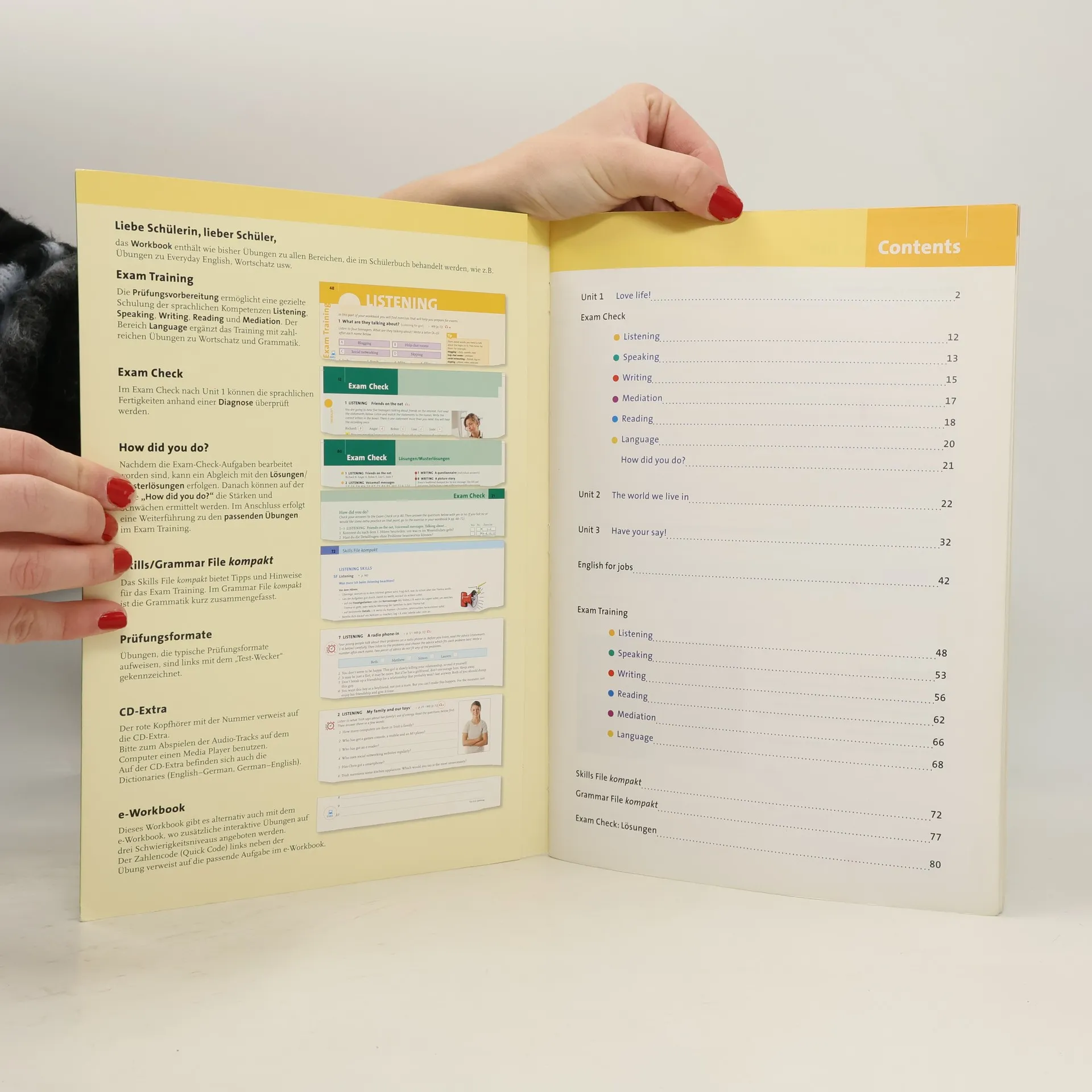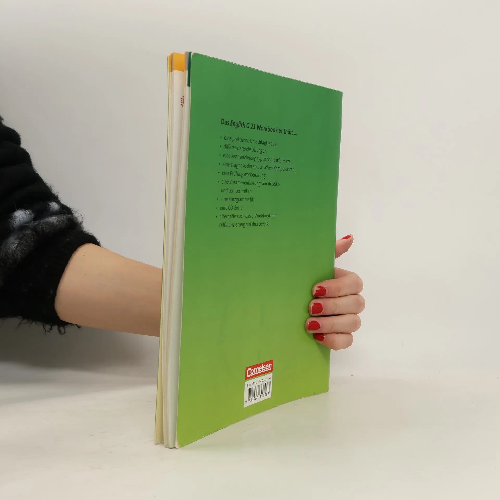 Das English G 21 Workbook enthält ...· eine praktische Umschlagkappe.· differenzierende Übungen.· eine Kennzeichnung typischer Testformate.· eine Diagnose der sprachlichen Kompetenzen.· eine Prüfungsvorbereitung.· eine Zusammenfassung von Arbeits- und Lerntechniken.· eine Kurzgrammatik.· eine CD-Extra.· alternativ auch das e-Workbook mit Differenzierung auf drei Levels.