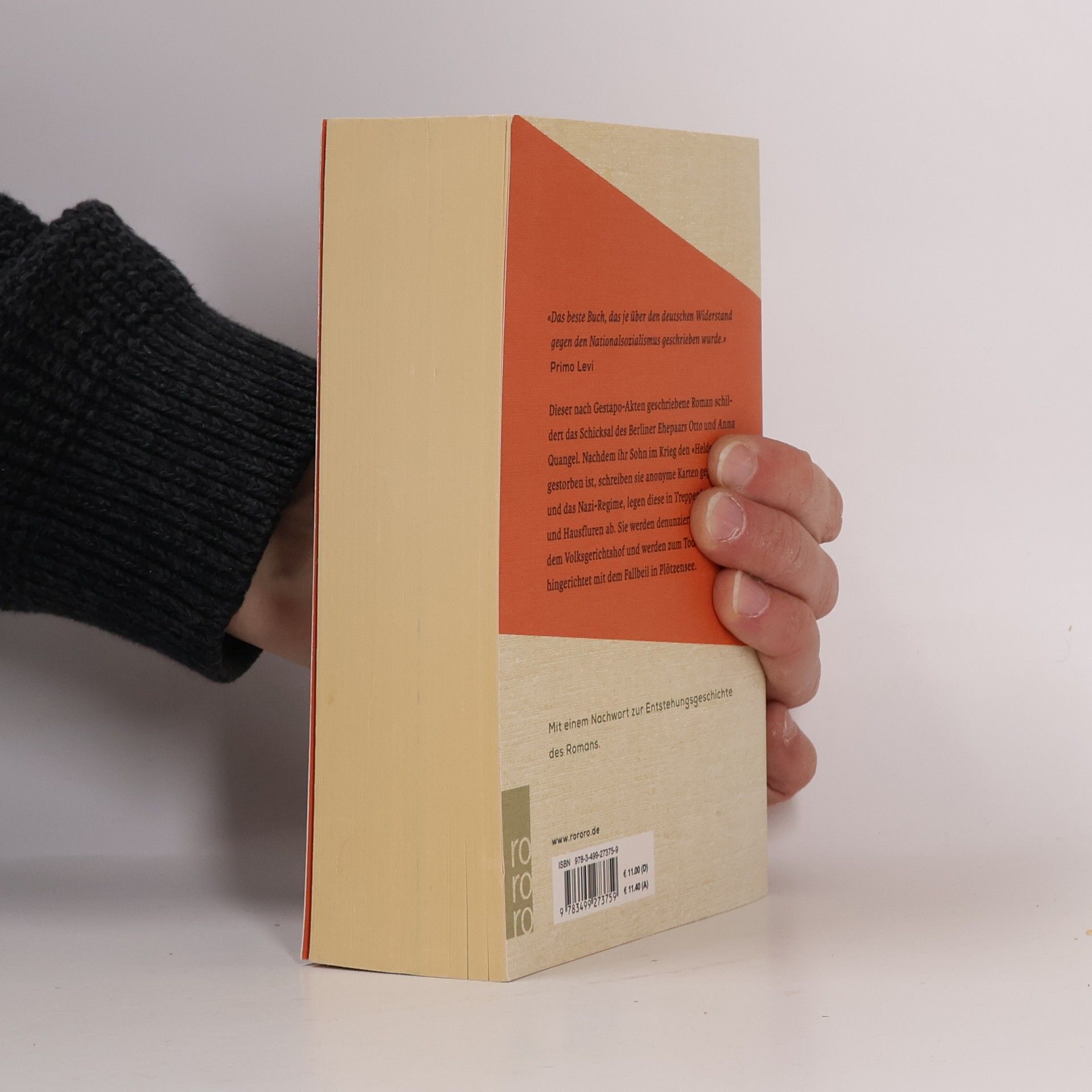 Dieser nach Gestapoakten geschriebene Roman des volkstümlichen deutschen Erzählers schildert das Schicksal des Berliner Arbeiterehepaars Quangel, das, vom Kriegstod des Sohnes aufgerüttelt, Widerstand auf eigenen Faust wagt. Die Maschinerie eines brutalen Totalitarismus zermalmt die alten Leute schließlich. Mit einem Nachwort zur Entstehungsgeschichte des Romans