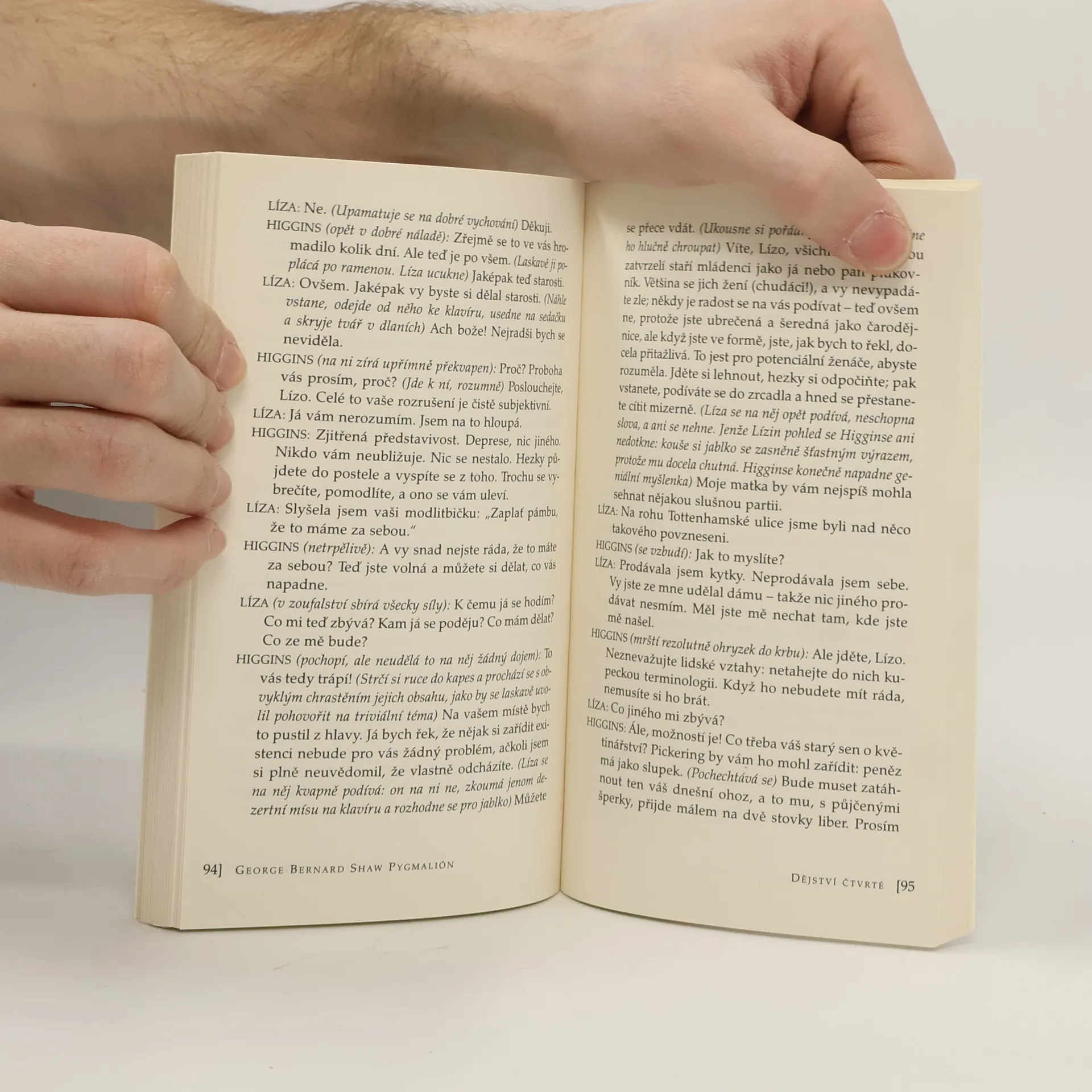 Slavná komedie o pěti dějstvích nese název podle pověsti o řeckém sochaři, jenž vytvořil sochu tak krásnou, že se do ní zamiloval a na bohyni Afrodité pro ni vyprosil řeč a život. Stala se předlohou slavného muzikálu My Fair Lady. 42. svazek edice D poprvé vychází česky včetně autorovy předmluvy a doslovu, který se věnuje dalším osudům hlavních postav hry.