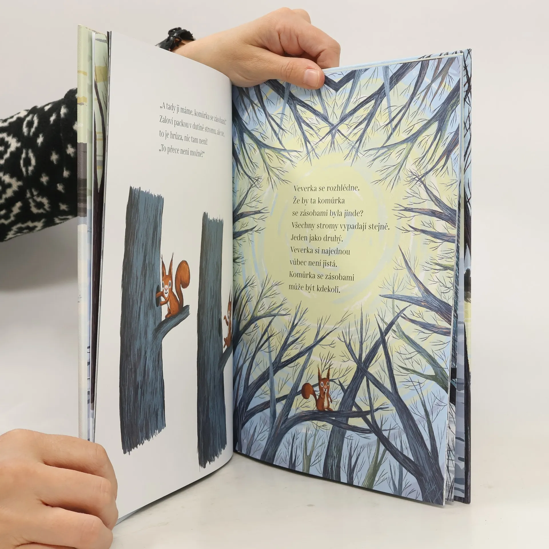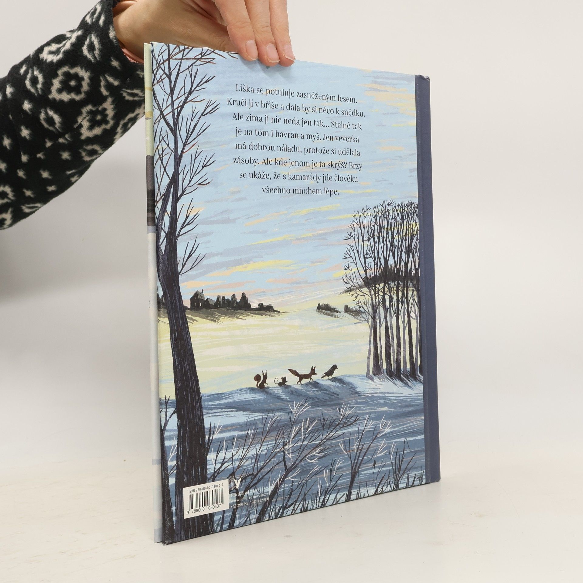 Liška se potuluje zasněženým lesem. Kručí jí v břiše a dala by si něco k snědku. Ale zima jí nic nedá jen tak... Stejně tak je na tom i havran a myš. Jen veverka má dobrou náladu, protože si udělala zásoby. Ale kde jenom je ta skrýš? Brzy se ukáže, že s kamarády jde člověku všechno mnohem lépe.