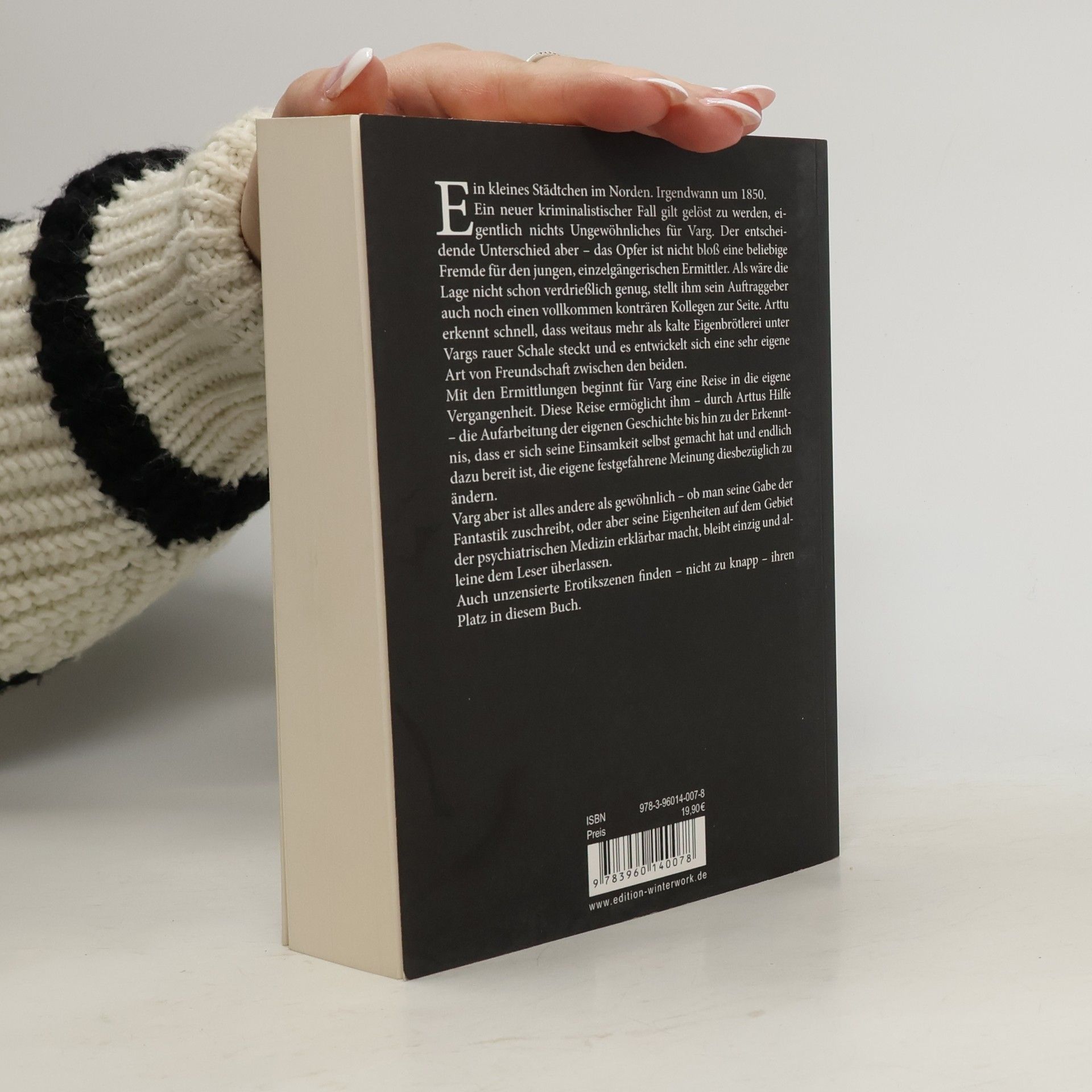 Ein kleines Städtchen im Norden. Irgendwann um 1850. Ein neuer kriminalistischer Fall gilt gelöst zu werden, eigentlich nichts Ungewöhnliches für Varg. Der entscheidende Unterschied aber - das Opfer ist nicht bloß eine beliebige Fremde für den jungen, einzelgängerischen Ermittler. Als wäre die Lage nicht schon verdrießlich genug, stellt ihm sein Auftraggeber auch noch einen vollkommen konträren Kollegen zur Seite. Arttu erkennt schnell, dass weitaus mehr als kalte Eigenbrötlerei unter Vargs rauer Schale steckt und es entwickelt sich eine sehr eigene Art von Freundschaft zwischen den beiden.Mit den Ermittlungen beginnt für Varg eine Reise in die eigene Vergangenheit. Diese Reise ermöglicht ihm - durch Arttus Hilfe - die Aufarbeitung der eigenen Geschichte bis hin zu der Erkenntnis, dass er sich seine Einsamkeit selbst gemacht hat und endlich dazu bereit ist, die eigene festgefahrene Meinung diesbezüglich zu ändern. Varg aber ist alles andere als gewöhnlich - ob man seine Gabe der Fantastik zuschreibt, oder aber seine Eigenheiten auf dem Gebiet der psychiatrischen Medizin erklärbar macht, bleibt einzig und alleine dem Leser überlassen.Auch unzensierte Erotikszenen finden - nicht zu knapp - ihren Platz in diesem Buch.