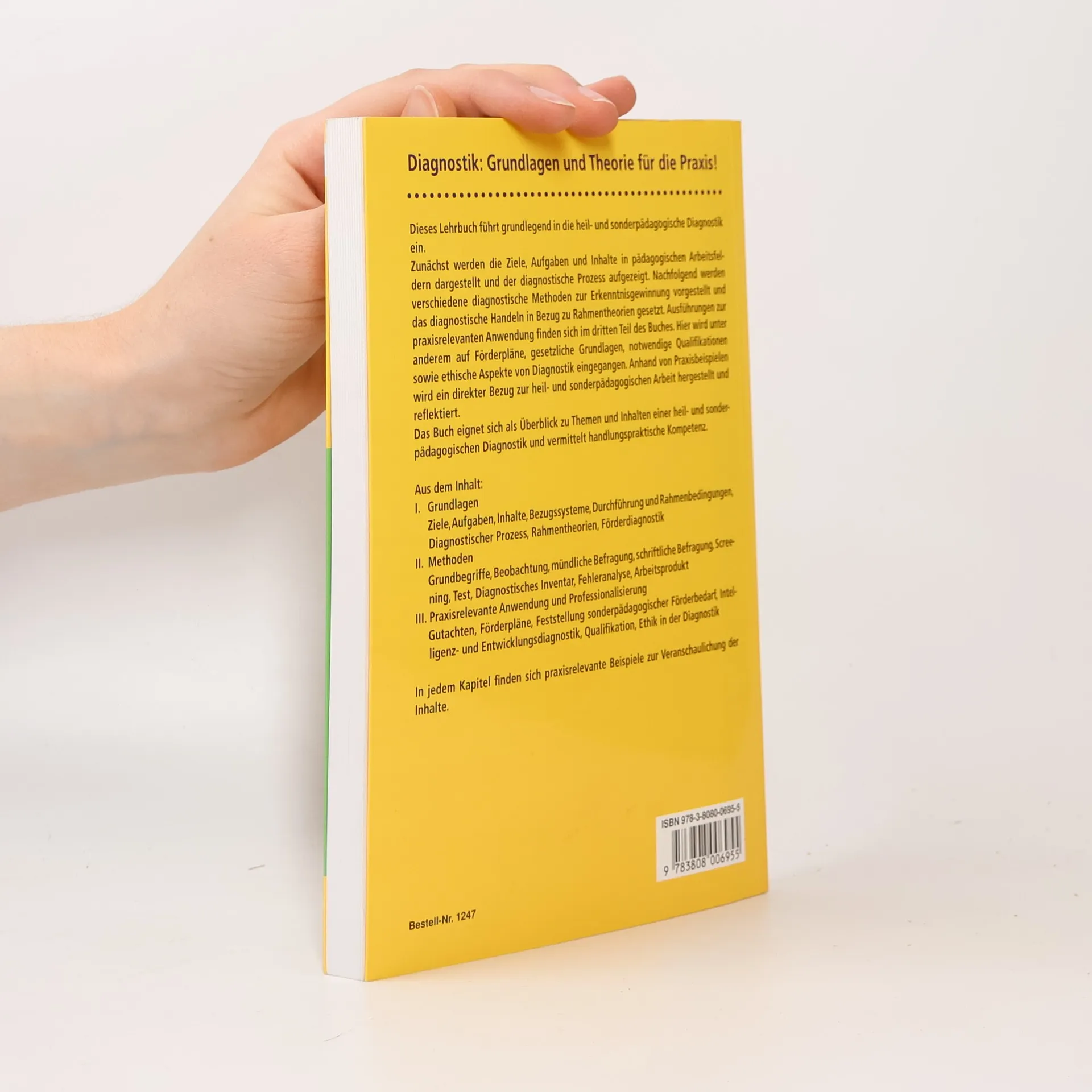Dieses Lehrbuch bietet eine grundlegende Einführung in die heil- und sonderpädagogische Diagnostik. Es beschreibt die Ziele, Aufgaben und Grenzen in pädagogischen Arbeitsfeldern und erläutert den diagnostischen Prozess. Verschiedene Methoden zur Erkenntnisgewinnung werden vorgestellt und in Bezug zu Rahmentheorien gesetzt. Der dritte Teil des Buches widmet sich der praxisrelevanten Anwendung, einschließlich Förderplänen, gesetzlichen Grundlagen, erforderlichen Qualifikationen und ethischen Aspekten der Diagnostik. Praxisbeispiele verdeutlichen den Bezug zur heil- und sonderpädagogischen Arbeit und fördern die Reflexion. Die Inhalte gliedern sich in drei Hauptbereiche: Zunächst werden die Grundlagen behandelt, einschließlich der Ziele, Aufgaben, Inhalte, Bezugssysteme, Durchführung und Rahmenbedingungen sowie der diagnostische Prozess und Rahmentheorien. Im zweiten Teil stehen verschiedene diagnostische Methoden im Fokus, wie Beobachtung, mündliche und schriftliche Befragungen, Screening, Tests und Fehleranalysen. Der letzte Abschnitt thematisiert die praxisrelevante Anwendung und Professionalisierung, einschließlich Gutachten, Förderplänen und der Feststellung sonderpädagogischen Förderbedarfs. Jedes Kapitel enthält praxisrelevante Beispiele zur Veranschaulichung der Inhalte und zur Förderung handlungspraktischer Kompetenz.