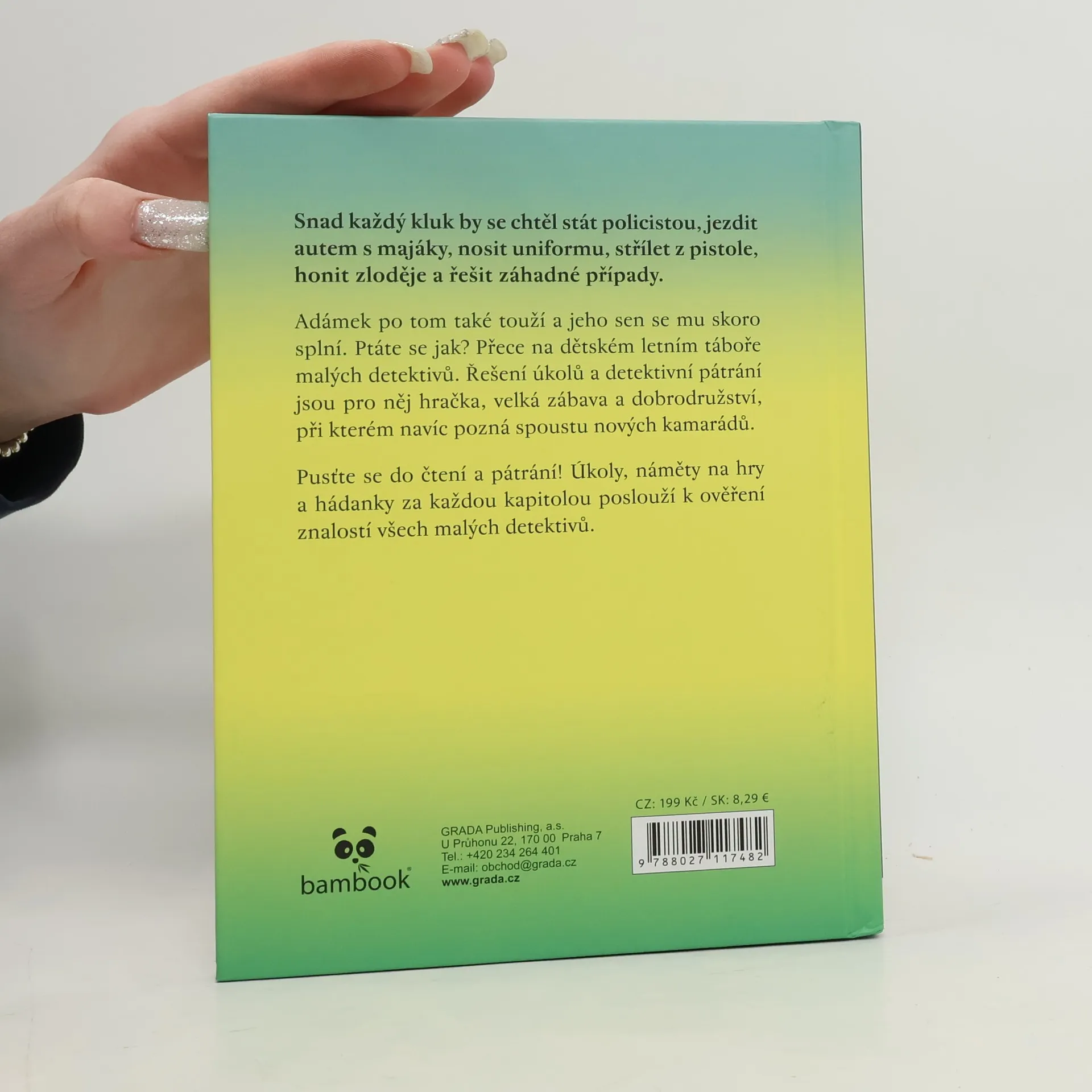 Snad každý kluk by se chtěl stát policistou, jezdit autem s majáky, nosit uniformu, střílet z pistole, honit zloděje a řešit záhadné případy. Adámek po tom také touží a jeho sen se mu skoro splní. Ptáte se jak? Přece na dětském letním táboře malých detektivů. Řešení úkolů a detektivní pátrání jsou pro něj hračka, velká zábava a dobrodružství, při kterém navíc pozná spoustu nových kamarádů. Pusťte se do čtení a pátrání! Úkoly, náměty na hry a hádanky za každou kapitolou poslouží k ověření znalostí všech malých detektivů.