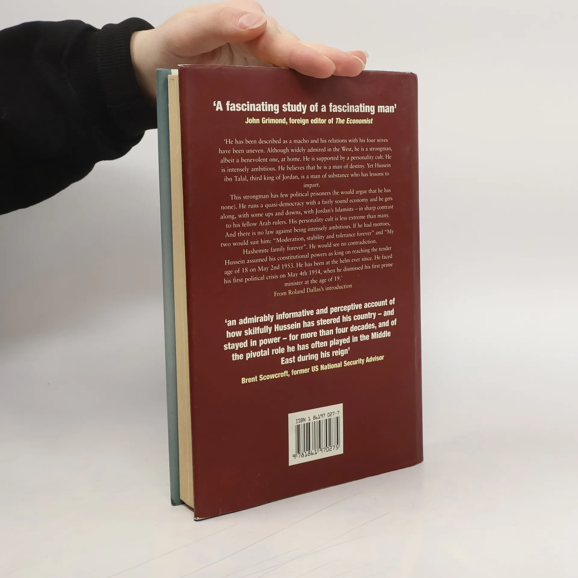 From his youth, when his grandfather was gunned down at his side in Jerusalem Hussein's life has been a dramatic one. He became king in 1953 and has been at the heart of Middle Eastern affairs ever since. Among serving heads of state and government, only Queen Elizabeth II has held office longer. He has achieved this by being a clever asserting early on in his reign his independence from Britain, but retaining close ties with the country where he was educated; establishing good relations with the Americans, and more importantly the Israelis; and maintaining Jordan's independence despite many setbacks, including the loss of the West Bank, and a difficult relationship with the Palestinians. The king has survived attempts on his life and in August 1998 was revealed to be battling cancer for the second time. In late October he was reported to have only three months to live. He has been married four times, once to an English woman and most recently to an American. He is a keen radio ham and an accomplished pilot - a complex man, equally at ease at a campfire with loyal Bedouins as at the controls of a Boeing 747. King Hussein's story is a fascinating one. It is also one that helps provide an understanding of the Middle East. Roland Dallas tells it with great zest and insight., and it is one life