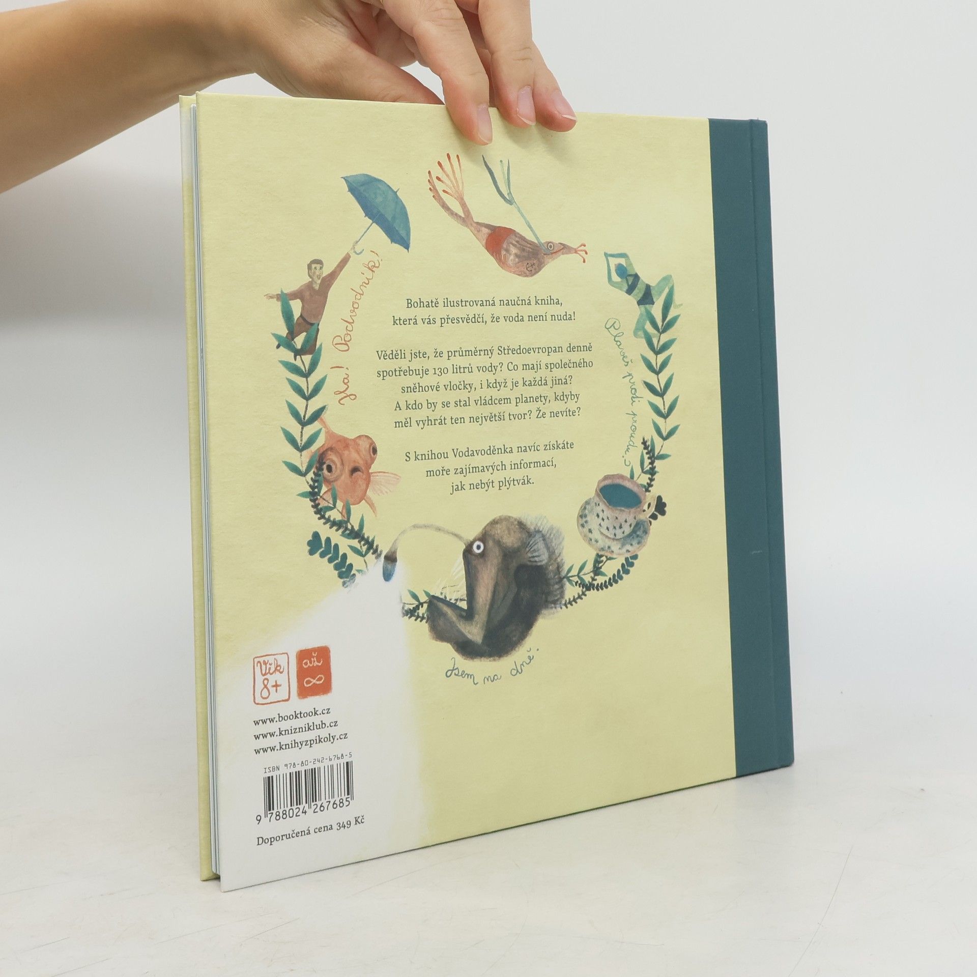 Bohatě ilustrovaná naučná kniha, která vás přesvědčí, že voda není nuda! Věděli jste, že průměrný Středoevropan denně spotřebuje 110 litrů vody? Co mají společného vločky, i když je každá jiná? A kdo by se stal vládcem planety, kdyby měl vyhrát ten největší tvor? Že nevíte? S knihou Voda voděnka získáte moře zajímavých informací, jak nebýt plýtvák. Kniha je určena pro děti od 8 let a jejich dospělé kamarády.
