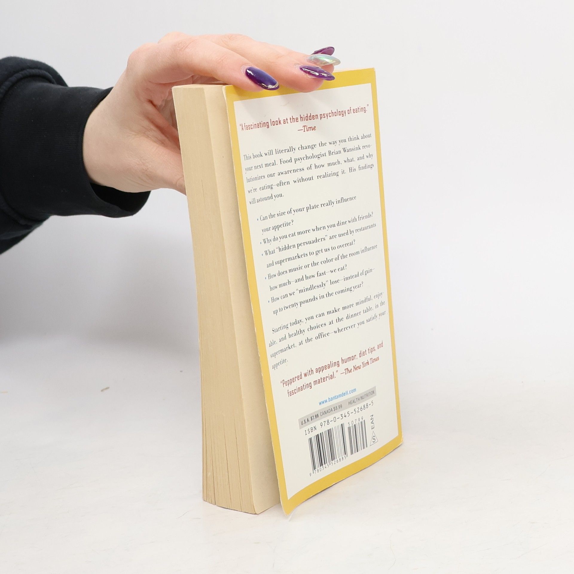This book will literally change the way you think about your next meal. Food psychologist Brian Wansink revolutionizes our awareness of how much, what, and why we’re eating—often without realizing it. His findings will astound you. • Can the size of your plate really influence your appetite? • Why do you eat more when you dine with friends? • What “hidden persuaders” are used by restaurants and supermarkets to get us to overeat? • How does music or the color of the room influence how much—and how fast—we eat? • How can we “mindlessly” lose—instead of gain—up to twenty pounds in the coming year? Starting today, you can make more mindful, enjoyable, and healthy choices at the dinner table, in the supermarket, at the office—wherever you satisfy your appetite.