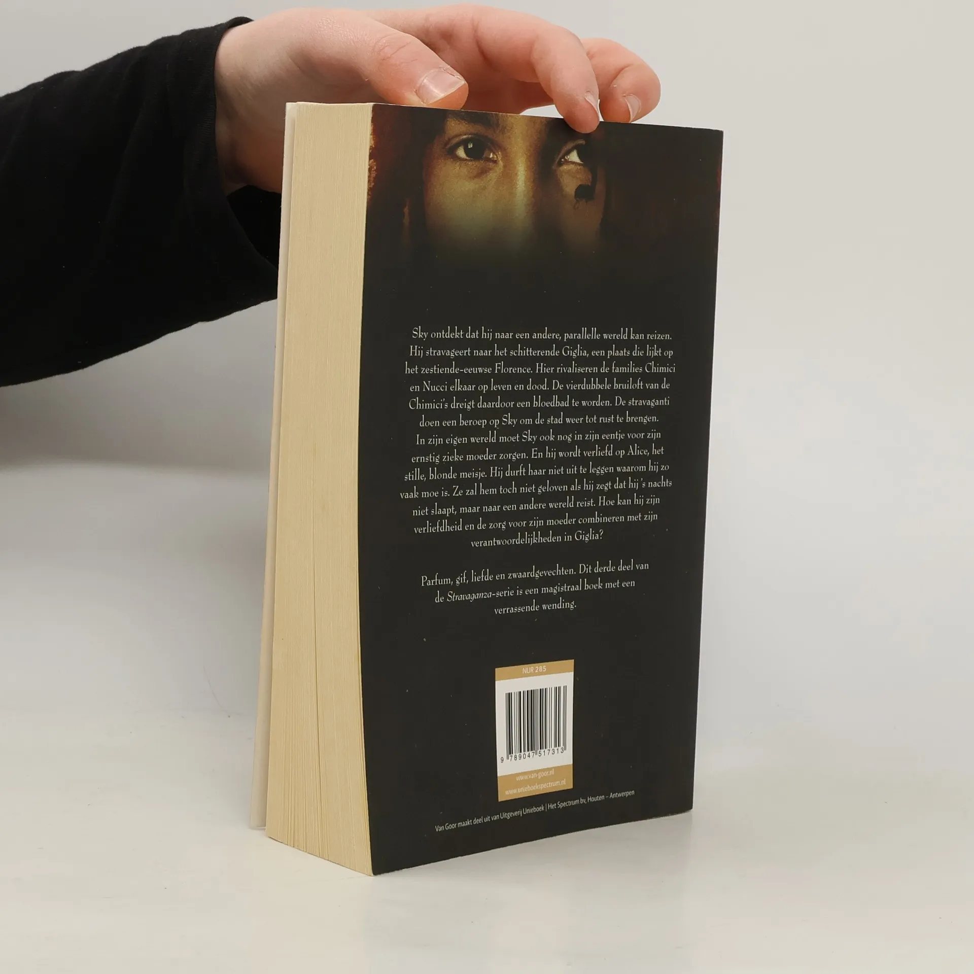 Sky ontdekt dat hij naar een andere, parallelle wereld kan reizen. Hij stravageert naar het schitterende Giglia, een plaats die lijkt op het zestiende-eeuwse Florence. Hier rivaliseren de families Chimici en Nucci elkaar op leven en dood. De vierdubbele bruiloft van de Chimici's dreigt daardoor een bloedbad te worden. De stravaganti doen een beroep op Sky om de stad weer tot rust te brengen. In zijn eigen wereld moet Sky ook nog in zijn eentje voor zijn ernstig zieke moeder zorgen. En hij wordt verliefd op Alice, het stille, blonde meisje. Hij durft haar niet uit te leggen waarom hij zo vaak moe is. Ze zal hem toch niet geloven als hij zegt dat hij 's nachts niet slaapt, maar naar een andere wereld reist. Hoe kan hij zijn verliefdheid en de zorg voor zijn moeder combineren met zijn verantwoordelijkheden in Giglia? Parfum, gif, liefde en zwaardgevechten. Dit derde deel van de Stravaganza-serie is een magistraal boek met een verrassende wending