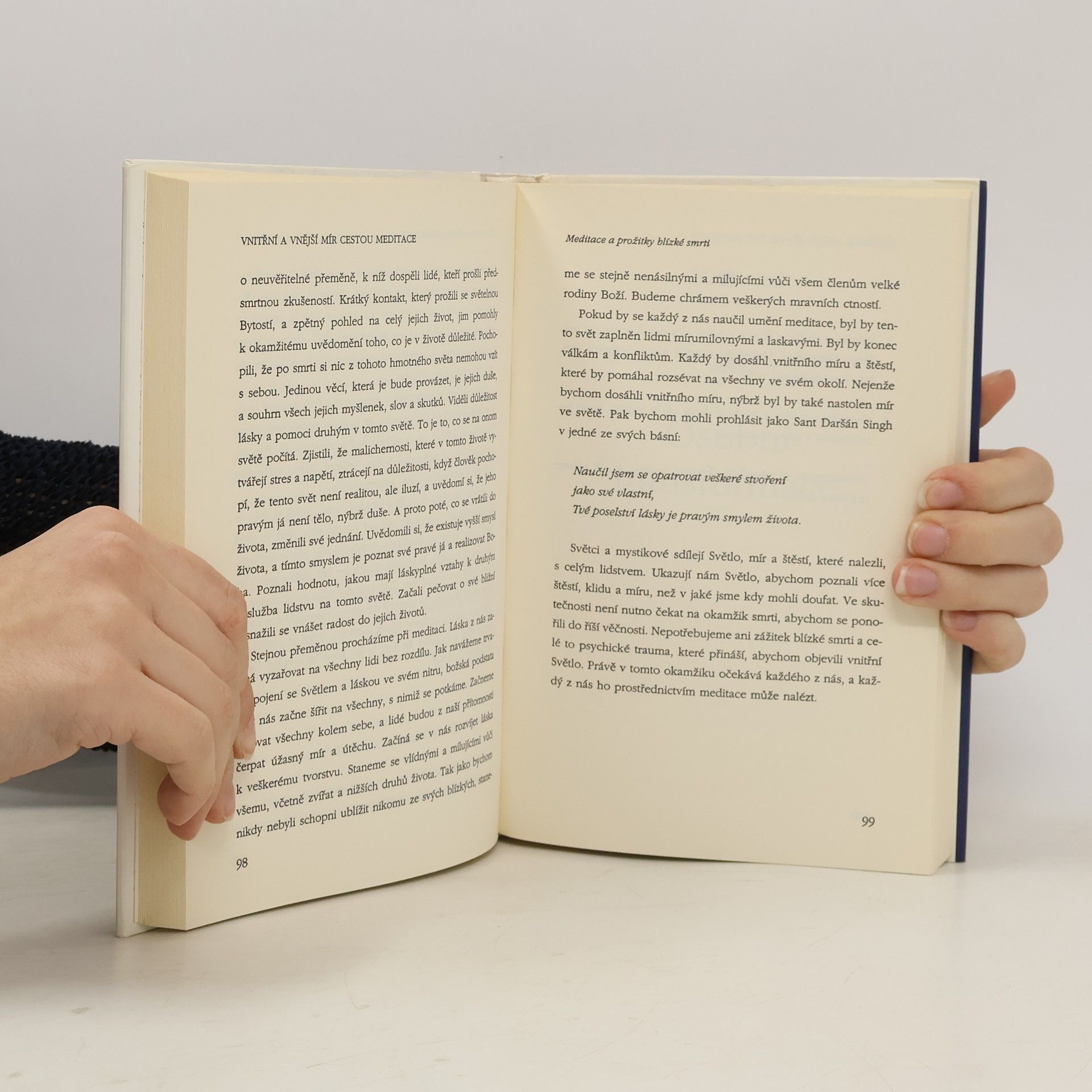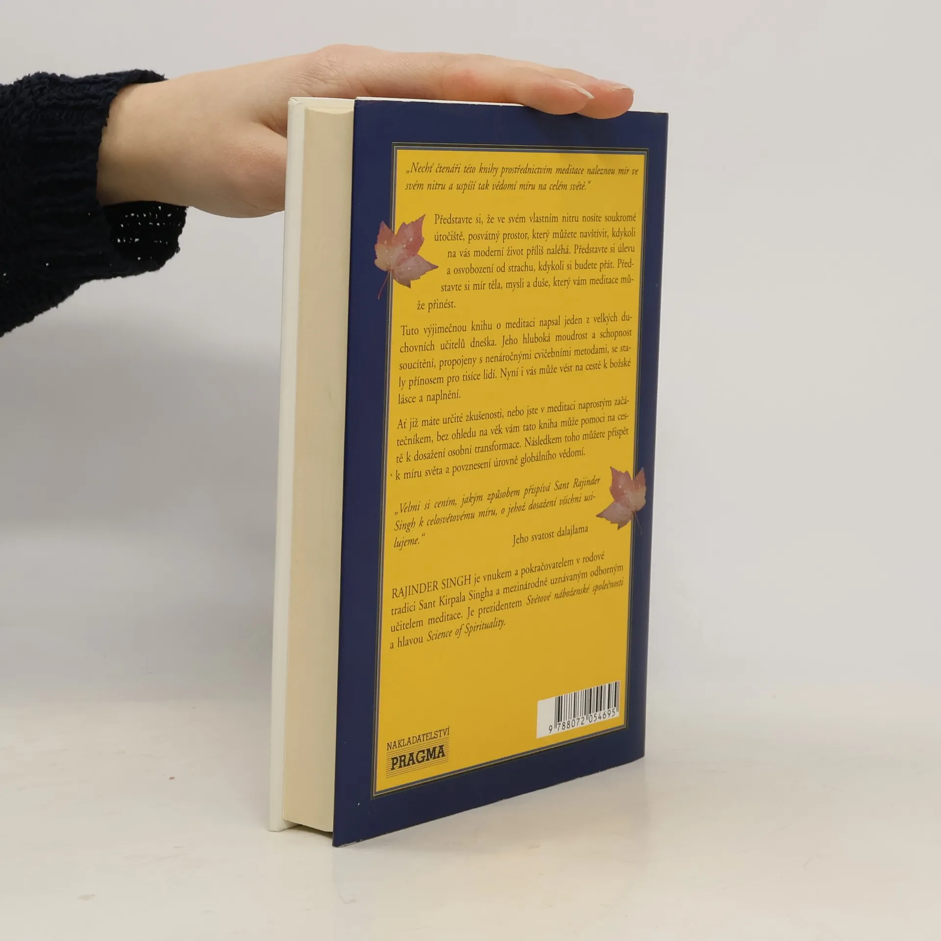 "Nechť čtenáři této knihy prostřednictvím meditace naleznou mír ve svém nitru a uspíší tak vědomí míru na celém světě." Představte si, že ve svém vlastním nitru nosíte soukromé útočiště., posvátný prostor, který můžete navštívit, kdykoli na vás moderní život příliš naléhá. Představte si úlevu a osvobození od strachu, kdykoli si budete přát. Představte si mír těla, mysli a duše, který vám meditace může přinést. Tuto vyjímečnou knihu o meditaci napsal jeden z velkých duchovních učitelů dneška. Jeho hluboká moudrost a schopnost soucítění, propojeny s nenáročnými cvičebními metodami, se staly přínosem pro tisíce lidí. Nyní i vás může vést na cestě k božské lásce a naplnění. Ať již máte určité zkušenosti, nebo jste v meditaci naprostým začátečníkem, bez ohledu na věk vám tato kniha může pomoci na cestě k dosažení osobní transformace. Následkem toho můžete přispět k míru světa a povznesení úrovně globálního vědomí. "Velmi si cením, jakým způsobem přispívá Sant Rajinder Singh k celosvětovému míru, o jehož dosažení všichni usilujeme." Jeho svatost dalajlama Rajinder Singh je vnukem a pokračovatelem v rodové tradici Sant Kirpala Singha a mezinárodně uznávaným odborným učitelem meditace. Je prezidentem Světové náboženské společnosti a hlavou Science of Spirituality