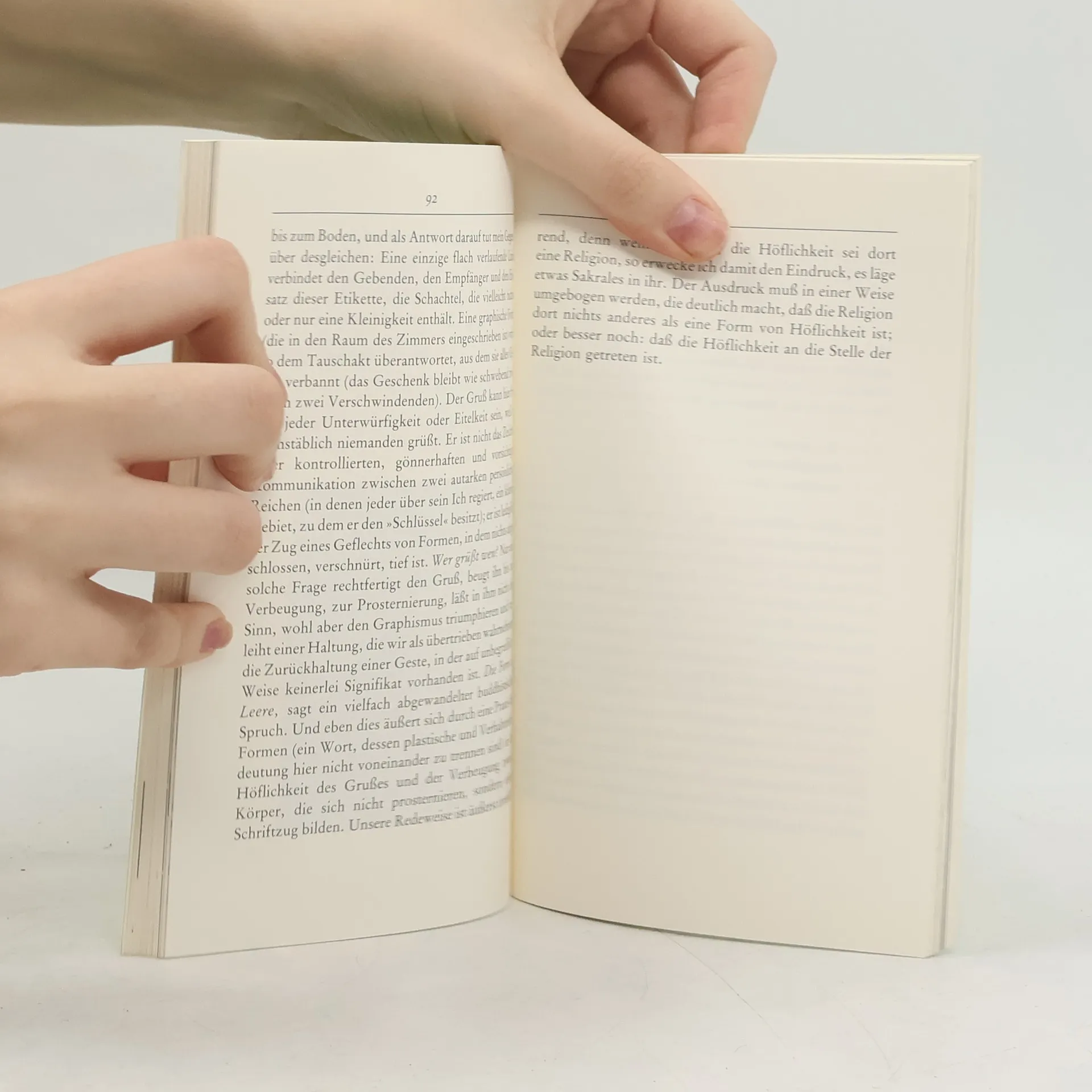 Auf einer Reise nach Japan wurde er mit der japanischen Zeichenwelt vertraut und bemerkte, daß diese Zeichen seiner Vorstellung vom Zeichen am nächsten kamen. Das japanische Zeichen ist stark: Es ist in bewundernswerter Weise Regeln unterworfen, angeordnet, dargestellt, niemals naturalisiert oder rationalisiert. Das japanische Zeichen ist leer: Sein Signifikat flieht, es gibt keinen Gott, keine Wahrheit, keine Moral, die diesen Signifikanten zugrunde liegt, die ohne ihr Gegenstück herrschen. Und vor allem sind die höhere Qualität dieses Zeichens, die Anmut seiner Behauptung und der erotische Charme, mit dem es auftritt, überall eingeprägt, auf den belanglosesten Gegenständen und Verhaltensweisen, die wir normalerweise in das Gebiet des Unbedeutenden oder Banalen verweisen.