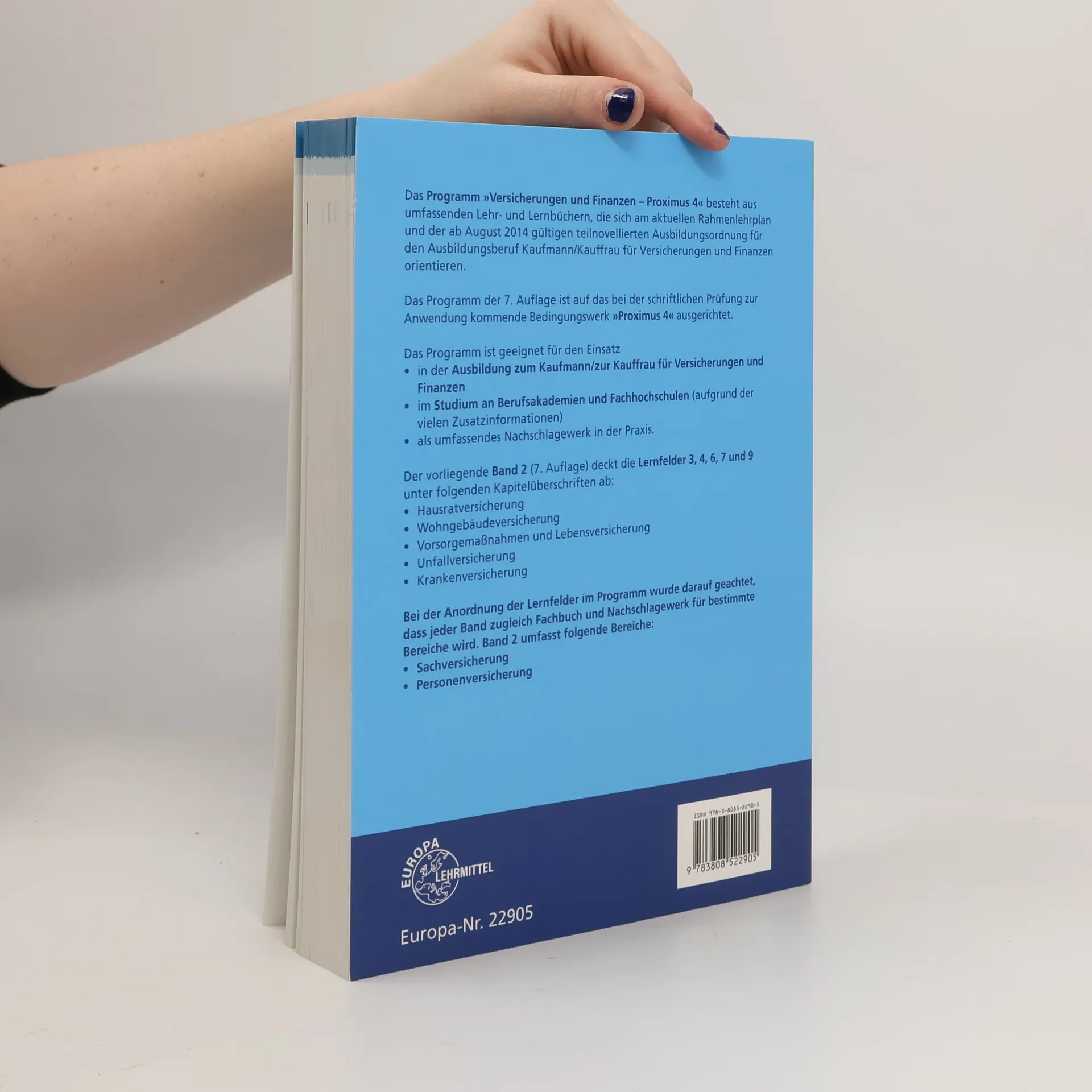 Das Programm Versicherungen und Finanzen Proximus 4 besteht aus umfassenden Lehr- und Lernbüchern, die sich am aktuellen Rahmenlehrplan und der ab August 2014 gültigen teilnovellierten Ausbildungsordnung für den Ausbildungsberuf Kaufmann/Kauffrau für Versicherungen und Finanzen orientieren. Band 2 deckt die Lernfelder 3, 4, 6, 7 und 9 ab. Die Reihe ist geeignet für den Einsatz in der Ausbildung, im Studium an Berufsakademien und Fachhochschulen (aufgrund der vielen Zusatzinformationen) sowie als umfassendes Nachschlagewerk in der Praxis. Folgende Merkmale kennzeichnen das Programm: - Lernsituationen am Ende jedes Hauptabschnitts - Zusätzliche Aufgaben innerhalb der Lernfelder - Hinweise auf Gesetze und Paragrafen am Rand des Textes - Zusatzinformationen im Kleindruck - Lernfeldkompass im vorderen Buchdeckel Die 7. Auflage dieser Buchreihe ist auf das vom Berufsbildungswerk der Versicherungswirtschaft herausgegebene Werk Proximus 4 Privatkunden Bedingungen und Tarife ausgerichtet. Änderungen der wirtschaftlichen Daten und gesetzlichen Rahmenbedingungen bis Ende Februar 2019 sind eingearbeitet.
