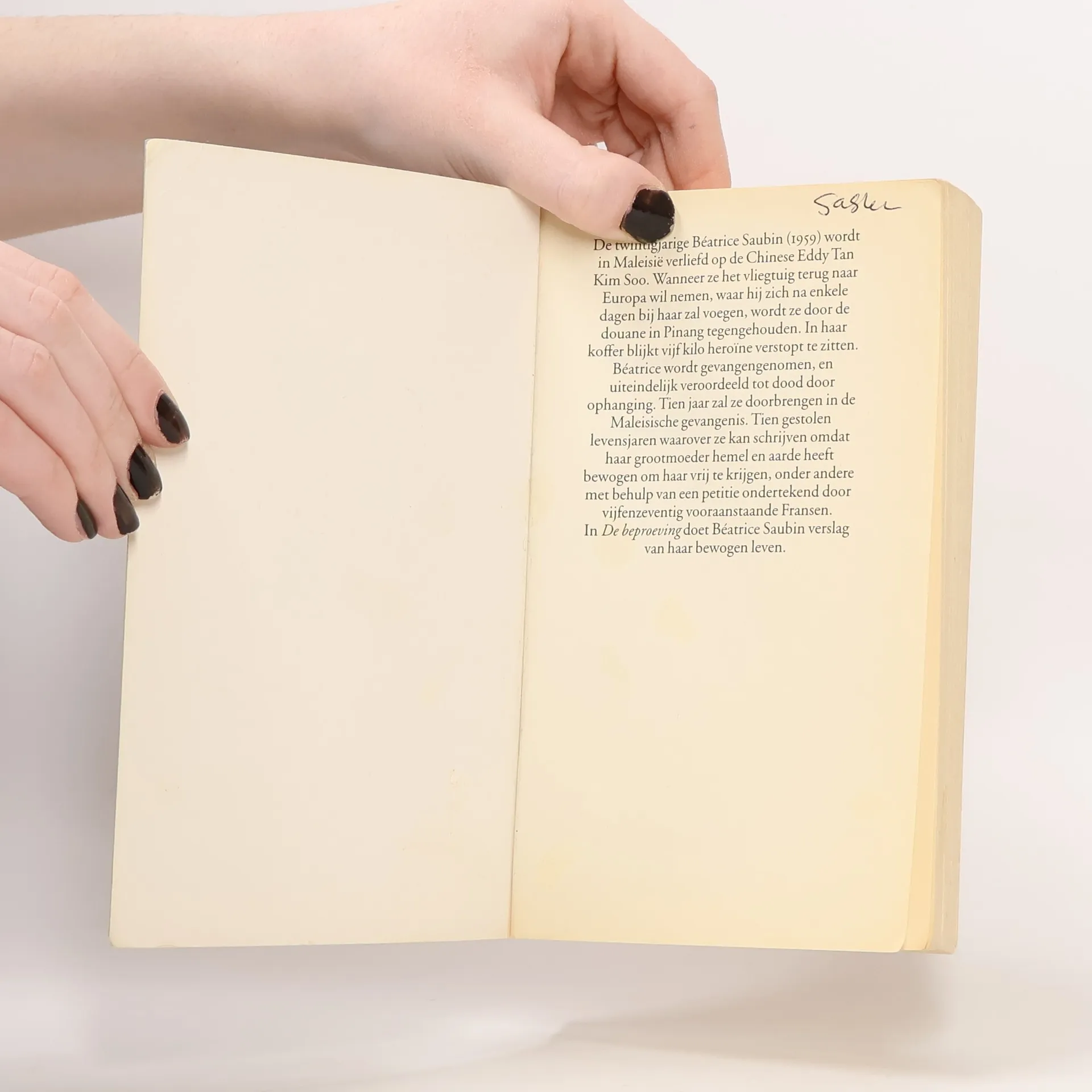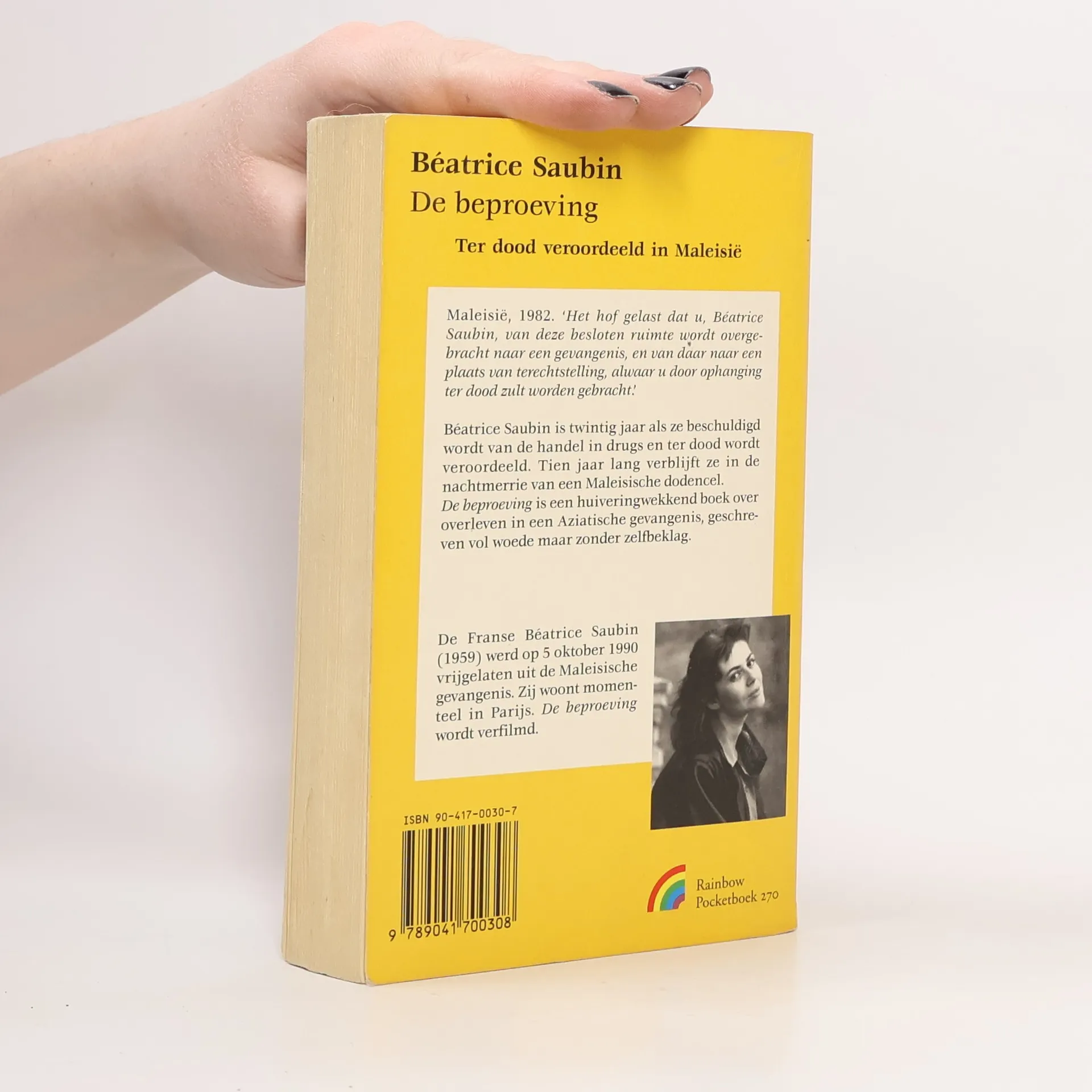 Maleisië, 1982. 'Het hof gelast dat u, Béatrice Saubin, van deze besloten ruimte wordt overgebracht naar een gevangenis, en van daar naar een plaats van terechtstelling, alwaar u door ophanging ter dood zult worden gebracht.' Béatrice Saubin is twintig jaar als ze beschuldigd wordt van de handel in drugs en ter dood wordt veroordeeld. Tien jaar lang verblijft ze in de nachtmerrie van een Maleisische dodencel. De beproeving is een huiveringwekkend boek over overleven in een Aziatische gevangenis, geschreven vol woede, maar zonder zelfbeklag. Autobiografie van een Frans meisje dat op haar twintigste jaar in een Maleisische gevangenis terechtkomt op grond van beschuldiging van drugshandel. Ze wordt ter dood veroordeeld, maar uiteindelijk na een verblijf van tien jaar vrijgelaten. Het boek is geschreven met hulp van een journalist, niettemin is de stijl enigszins hortend. De inhoud is echter zo authentiek en met gevoel voor detail geschreven, dat dat nauwelijks stoort. Een boek dat van begin tot eind boeit vanwege de bizarre gebeurtenissen en de geestkracht van Béatrice, en dat tevens een goed beeld geeft van het strafrecht, het gevangenisregime en de drugsbestrijding in Maleisië. Het boek wordt verfilmd. Pocketeditie, normale druk. (Biblion recensie, Mr. A.M.W. Verdegaal.)