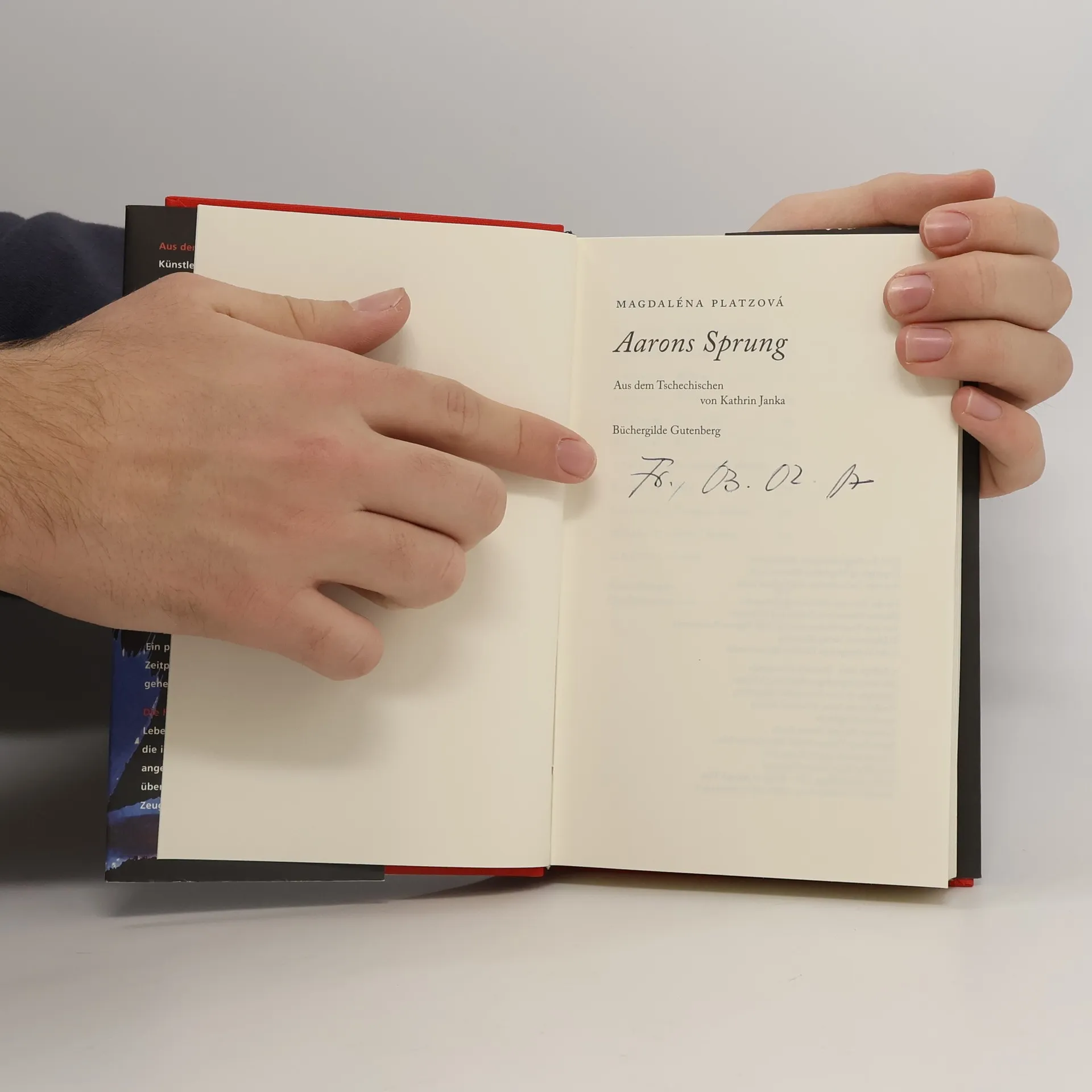 Platzova, Magdalena: Aarons Sprung, Aus dem Tschechischen von Kathrin Janka, DEA, Frankfurt/Main, Büchergilde Gutenberg 2009, 252 S., OLwd. m. OU., gut erhalten