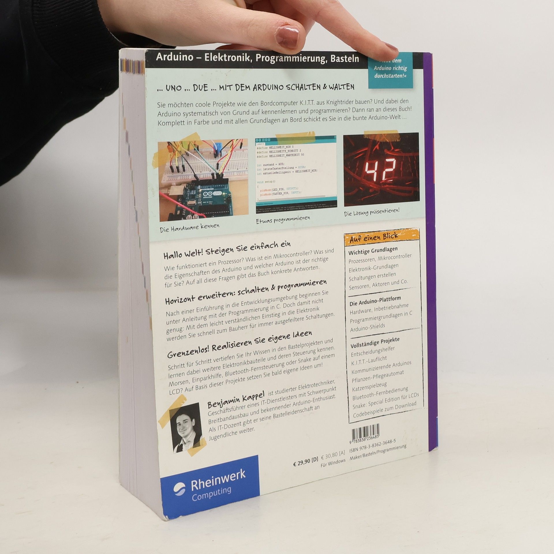 Ob Sie coole Projekte wie den Bordcomputer K.I.T.T aus Knight Rider realisieren oder Ihren Arduino ganz systematisch von Grund auf kennenlernen und programmieren wollen: Mit diesem Buch gelingt Ihnen beides! Angefangen bei Hardware- und Elektronikgrundlagen über den Einstieg in die Programmierung mit C bis zu vollständigen Praxisbeispielen (Wohnungspflanzen-Pflegeautomat, Bau eines elektronischen Spielzeugs für Katzen etc.) bietet Ihnen dieses Buch alles, was Sie für einen spannenden und erfolgreichen Arduino-Start benötigen.§Aus dem Inhalt:§§Prozessoren, Microcontroller und Co.§Die Hardware des Arduino im Detail§Benötigte Elektronik-Grundlagen§Entwicklungsumgebung und Programmiergrundlagen in C§Zahlreiche Beispielprojekte mit vollständigem Schaltungsaufbau und Programmiercode, u. a.:§Entscheidungshelfer§Nachbau der Frontbeleuchtung von K.I.T.T,§kommunizierende Arduinos,§Pflanzen-Pflegeautomat,§Heimautomation§u. v. m. §§Galileo Press heißt von jetzt an Rheinwerk Verlag.