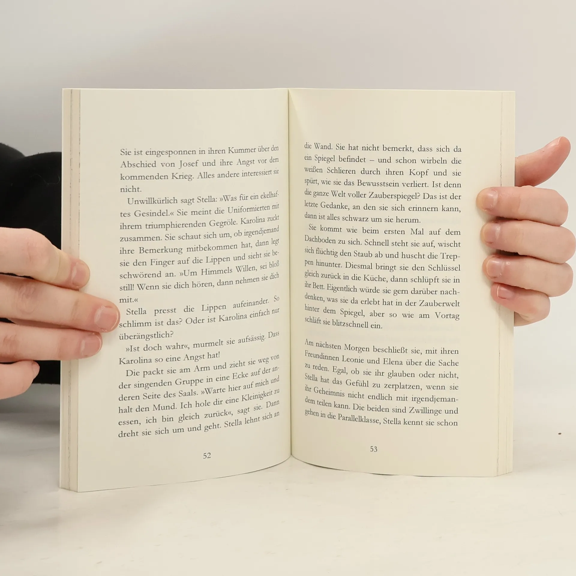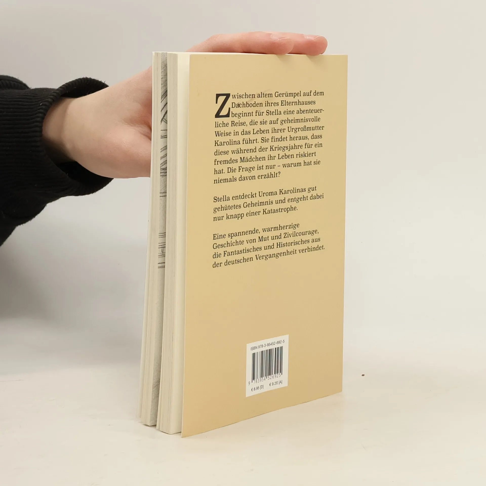Zwischen altem Gerümpel auf dem Dachboden ihres Elternhauses beginnt für Stella eine abenteuerliche Reise, die sie auf geheimnisvolle Weise in das Leben ihrer Urgroßmutter Karolina führt. Sie findet heraus, dass diese während der Kriegsjahre für ein fremdes Mädchen ihr Leben riskiert hat. Die Frage ist nur – warum hat sie niemals davon erzählt? Stella entdeckt Uroma Karolinas gut gehütetes Geheimnis und entgeht dabei nur knapp einer Katastrophe. Eine spannende, warmherzige Geschichte von Mut und Zivilcourage, die Fantastisches und Historisches aus der deutschen Vergangenheit auf anrührende Weise verbindet.