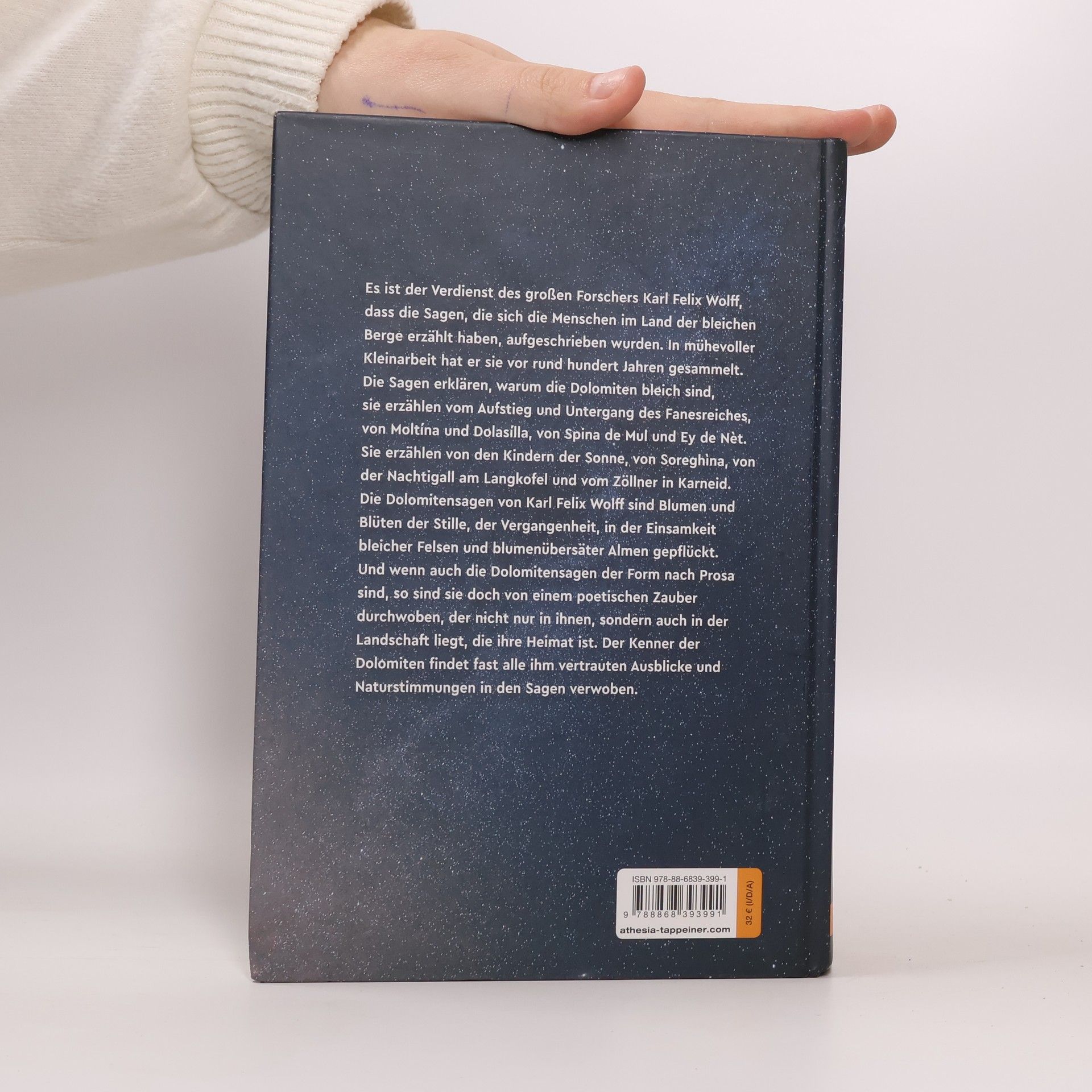 Es ist das Verdienst des großen Forschers Karl Felix Wolff, dass die Sagen, die sich die Menschen im Land der bleichen Berge erzählt haben, aufgeschrieben wurden. In mühevoller Kleinarbeit hat er vor rund hundert Jahren die Sagen gesammelt. Die Sagen erklären, warum die Dolomiten bleich sind, sie erzählen die Sage vom Aufstieg und Untergang des Fanesreiches, von Moltina und Dolasilla, von Spina de Mul und Ey de Net. Sie erzählen von den Kindern der Sonne, von Soreghina und., von der Nachtigall am Langkofel und vom Zöllner in Karneid. Die Dolomitensagen Karl Felix Wolffs sind Blumen und Blüten der Stille, der Vergangenheit, in der Einsamkeit bleicher Felsen und blumenübersäter Almen gepflückt. Und wenn auch die Dolomitensagen der Form nach Prosa sind, so sind sie doch von einem poetischen Zauber durchwoben, der nicht nur in ihnen, sondern auch in der Landschaft liegt, die ihre Heimat ist. Der Kenner der Dolomiten findet fast alle ihm vertrauten Ausblicke und Naturstimmungen in den Sagen verwoben.