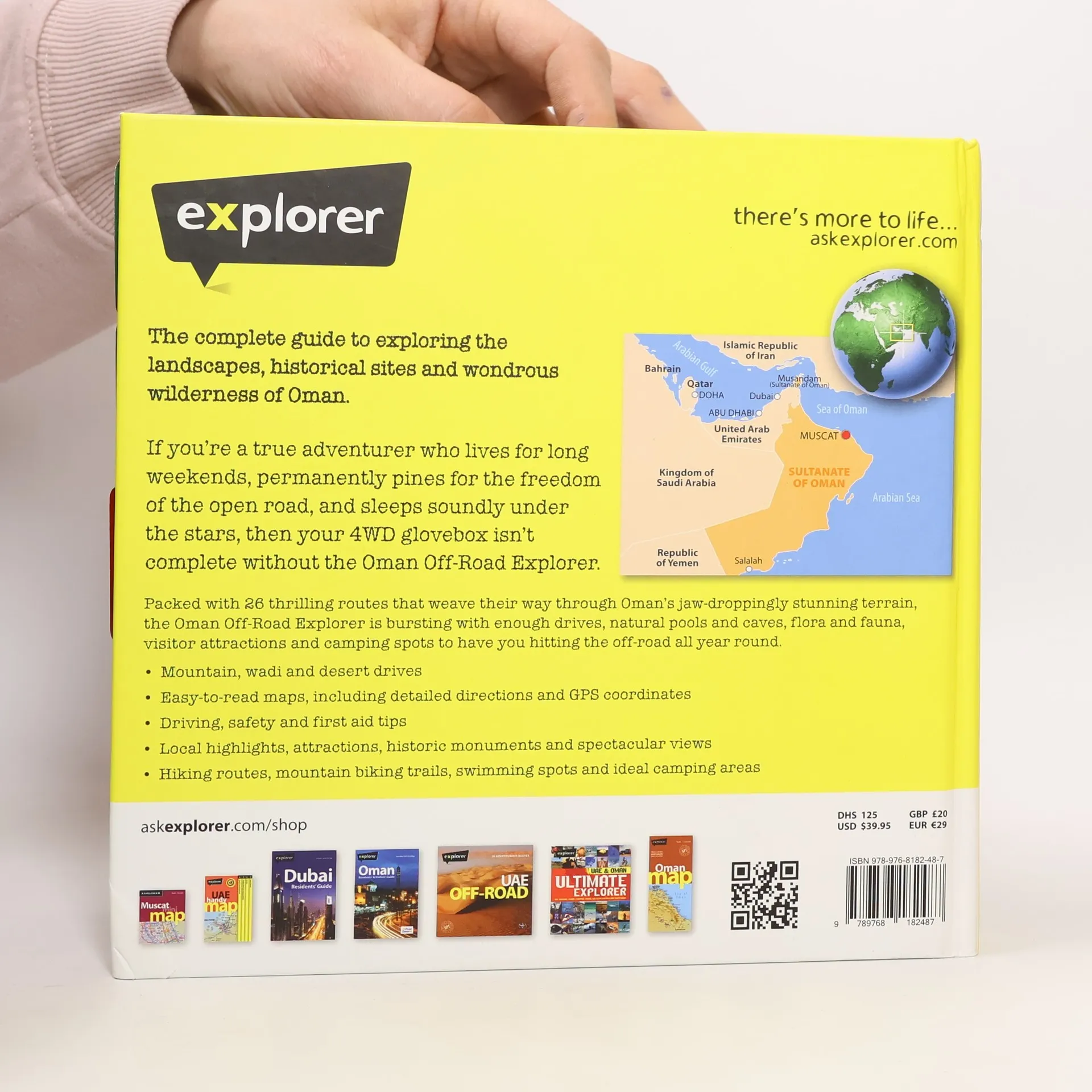 The ultimate accessory for any 4WD, the Oman Off-Road Explorer helps drivers to discover Oman's 'outback.' Detailed yet easy-to-use maps feature superimposed routes, GPS coordinates and points of interest.This guide Mountain, wadi & desert drives ; Easy-to-read maps ; GPS compatible ; Local highlights & attractions ; Camping and hiking ; Flora and fauna ; First aid advice ; Driving tips ; Comprehensive directory.This guide Musandam ; Western Hajar South ; Western Hajar North ; East Coast ; Dhofar.