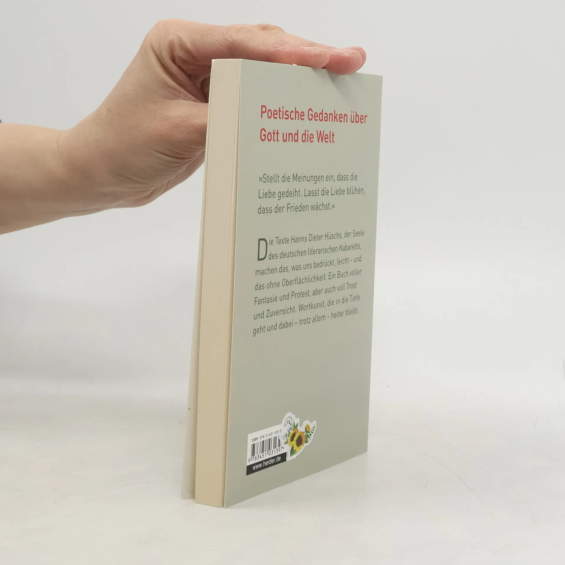 Der große Querkopf und der Republik: Hanns Dieter Hüsch, die Seele des deutschen Kabaretts, machte das, was uns auf der Seele lastet, leicht – und das ohne Oberflächlichkeit. Er bekannte Farbe, wo andere kuschen. Ein Buch voller Fantasie und Protest, aber auch voll Trost und Zuversicht. Texte, die in die Tiefe gehen und dabei – trotz allem – heiter bleiben. »Stellt die Meinungen ein, dass die Liebe gedeiht. Lasst die Liebe blühen, dass der Frieden wächst.« Hanns Dieter Hüsch