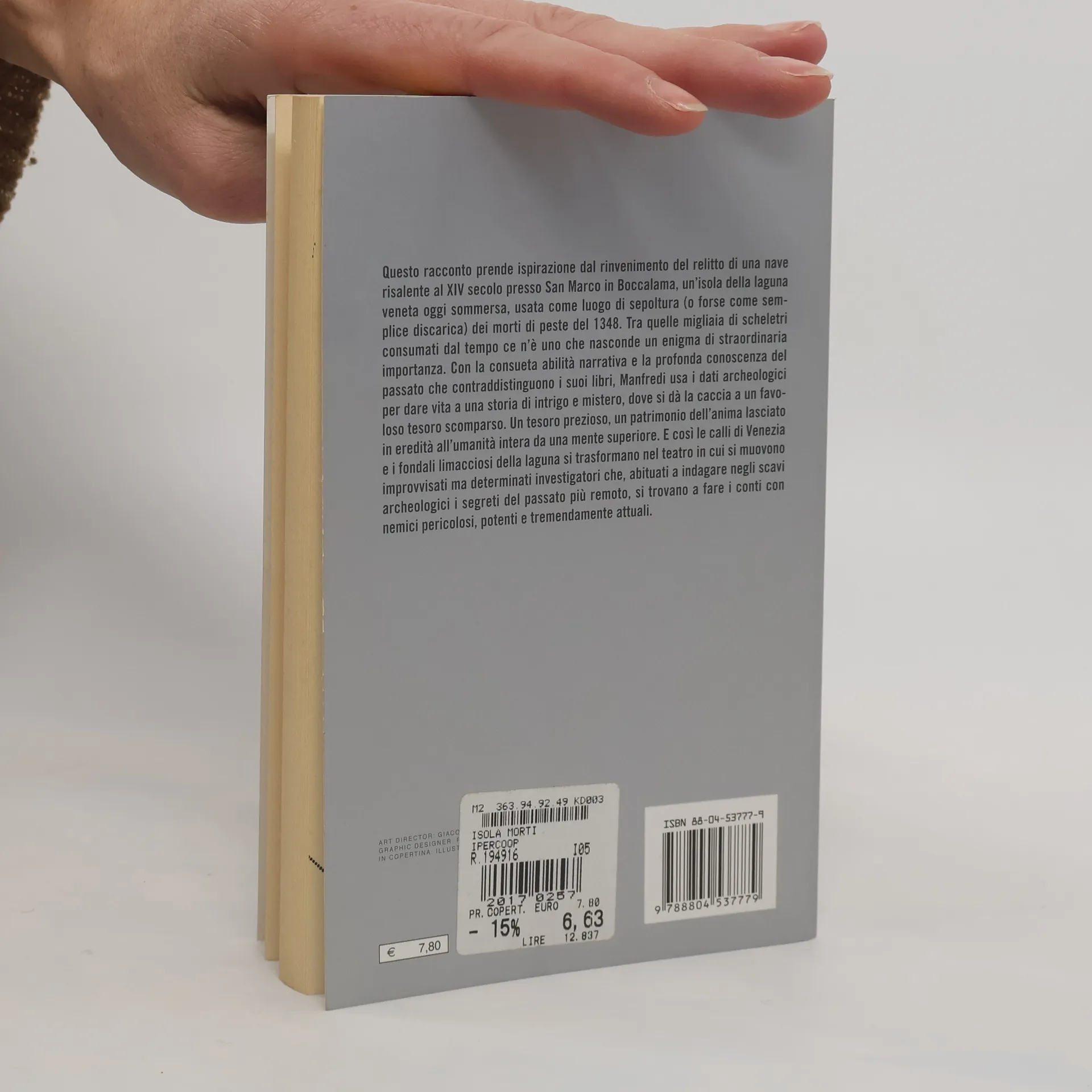 Questo racconto prende ispirazione dal rinvenimento del relitto di una nave risalente al XIV secolo presso San Marco in Boccalama, un'isola della laguna veneta oggi sommersa, usata come luogo di sepoltura (o forse come semplice discarica) dei morti di peste del 1348. Tra quelle migliaia di scheletri consumati dal tempo ce n'è uno che nasconde un enigma di straordinaria importanza. Con la consueta aioità narrativa e la profonda conoscenza del passato che contraddistinguono i suoi libri, Manfredi usa i dati archeologici per dare vita a una storia di intrigo e mistero, dove si dà la caccia a un favoloso tesoro scomparso. I tesoro prezioso, un patrimonio dell'anima lasciato in eredità all'umanità intera da una mente superiore. E così le calli di Venezia e i fondali limacciosi della laguna si trasformano nel teatro in cui si muovono improvvisati ma determinati investigatori che, abituati a indagare negli scavi archeologici i segreti del passato più remoto, si trovano a fare i conti non nemici pericolosi e tremendamente attuali.