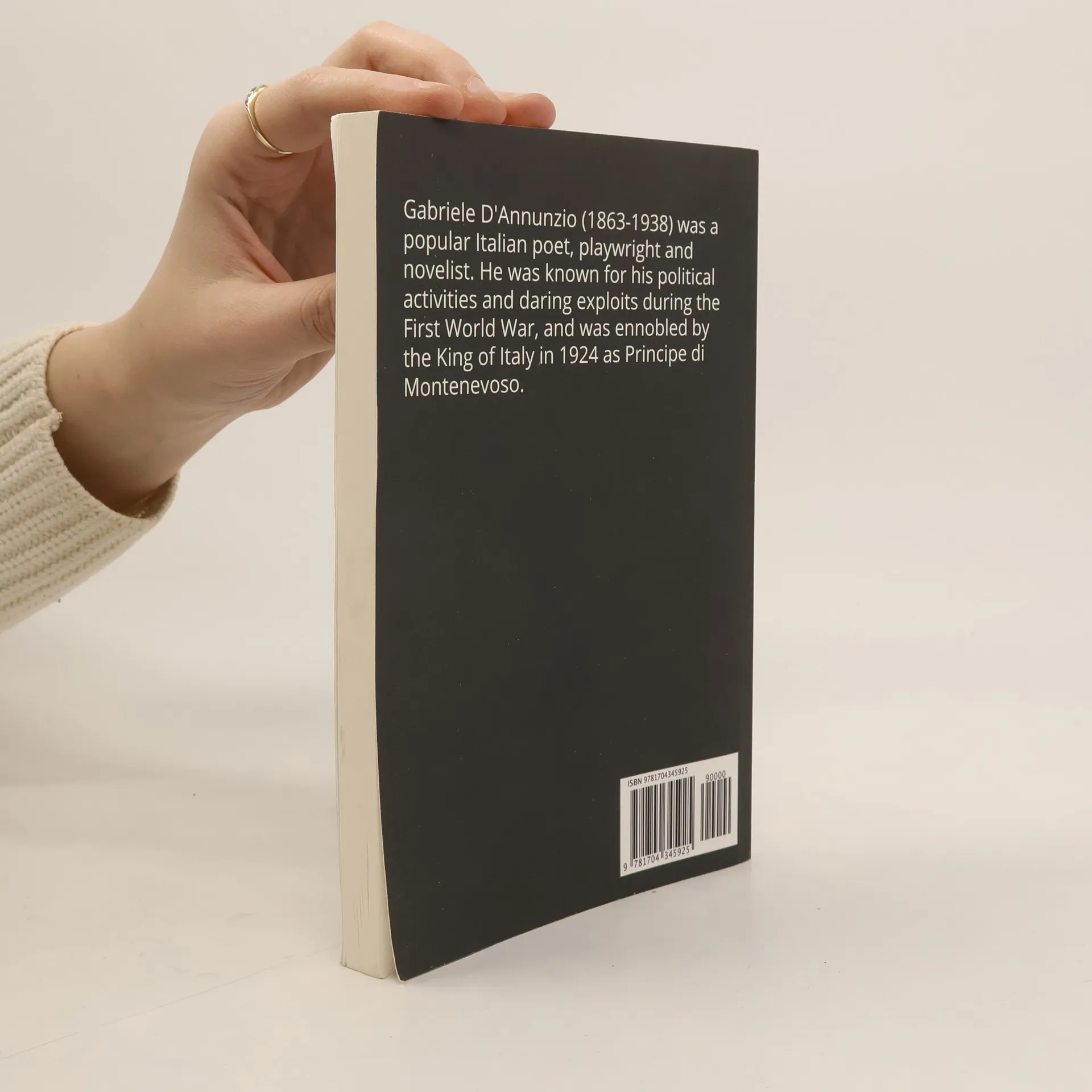 Gabriele D'Annunzio (1863-1938) was a popular Italian poet, playwright and novelist. He was known for his political activities and daring exploits during the First World War, and was ennobled by the King of Italy in 1924 as Principe di Montenevoso.