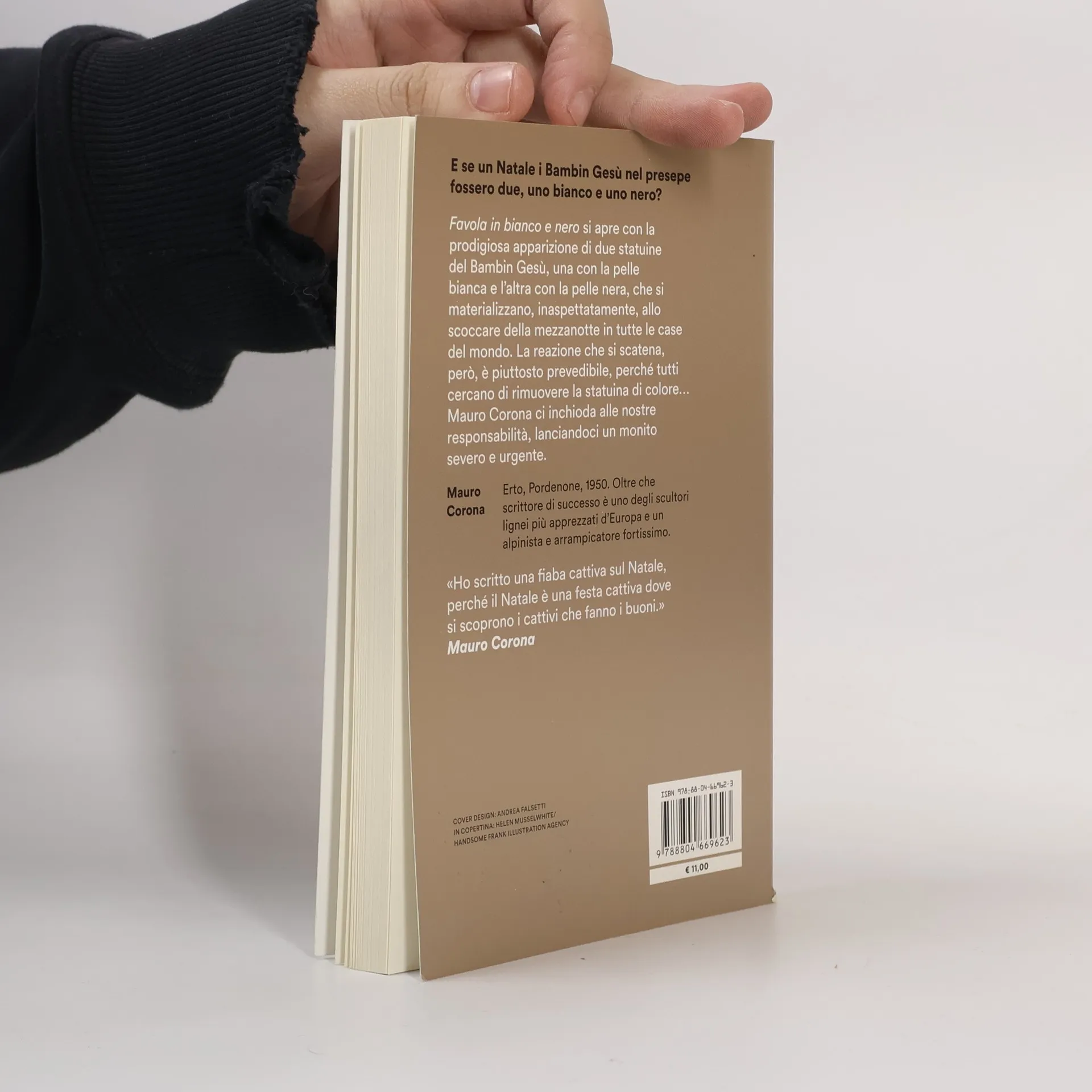 Favola in bianco e nero si apre con la prodigiosa apparizione di due statuine del Bambin Gesù, una con la pelle bianca e l'altra con la pelle nera, che si materializzano, inaspettatamente, allo scoccare della mezzanotte in tutte le case del mondo. La reazione che si scatena, però, è piuttosto prevedibile, perché tutti cercano di rimuovere la statuina di colore… Mauro Corona ci inchioda alle nostre responsabilità, lanciandoci un monito severo e urgente.