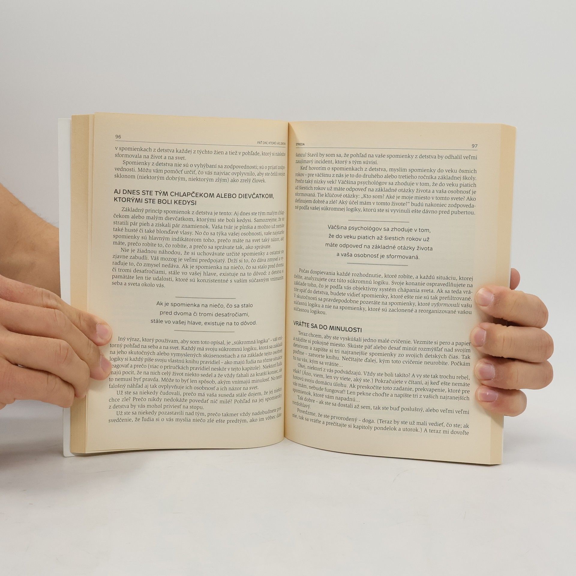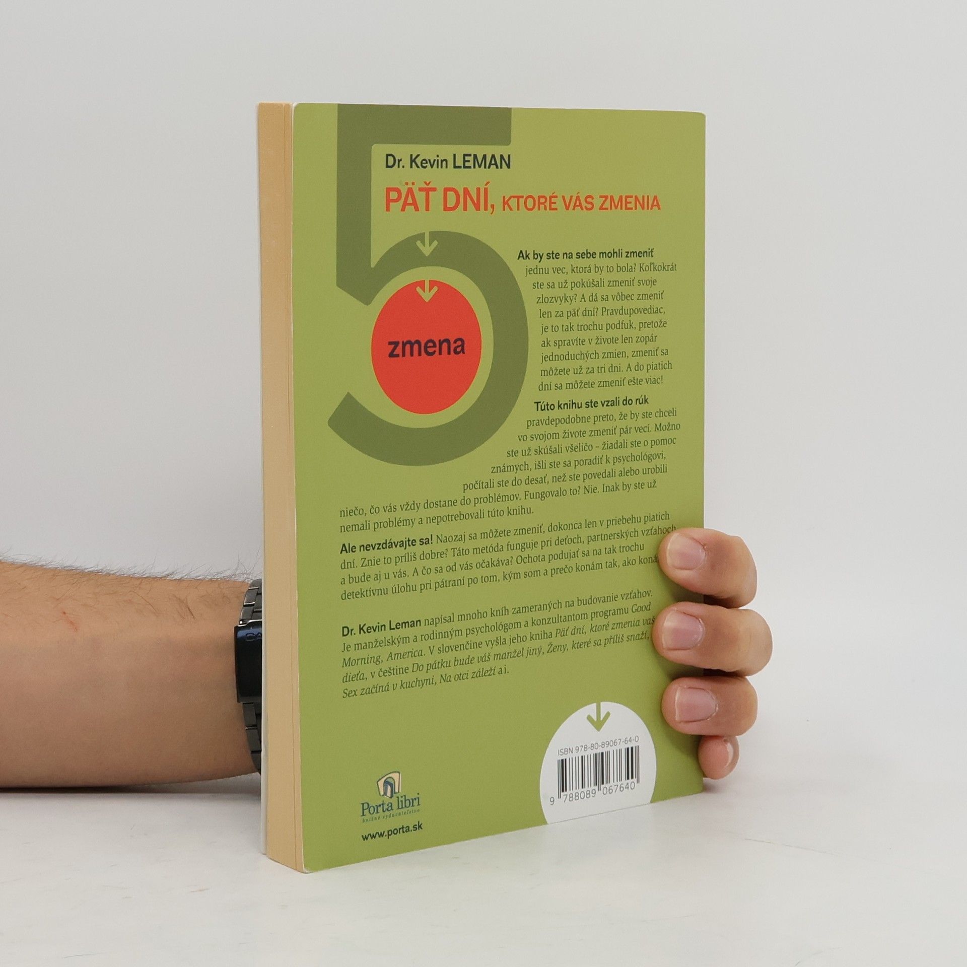 Ako sa dá do piatich dní prijať seba samého, prebudiť sebadôveru a premeniť svoj život. Ak by ste na sebe mohli zmeniť jednu vec, ktorá by to bola? Koľkokrát ste sa už pokúšali zmeniť svoje zlozvyky? A dá sa vôbec zmeniť len za päť dní? Pravdupovediac, je to tak trochu podfuk, pretože ak spravíte v živote len zopár jednoduchých zmien, zmeniť sa môžete už za tri dni. A do piatich dní sa môžete zmeniť ešte viac! Túto knihu ste vzali do rúk pravdepodobne preto, že by ste chceli vo svojom živote zmeniť pár vecí. Možno ste už skúšali všeličo – žiadali ste o pomoc známych, išli ste sa poradiť k psychológovi, počítali ste do desať, než ste povedali alebo urobili niečo, čo vás vždy dostane do problémov. Fungovalo to? Nie. Inak by ste už nemali problémy a nepotrebovali túto knihu. Ale nevzdávajte sa! Naozaj sa môžete zmeniť, dokonca len v priebehu piatich dní. Znie to príliš dobre? Táto metóda funguje pri deťoch, partnerských vzťahoch a bude aj u vás. A čo sa od vás očakáva? Ochota podujať sa na tak trochu detektívnu úlohu pri pátraní po tom, kým som a prečo konám tak, ako konám.