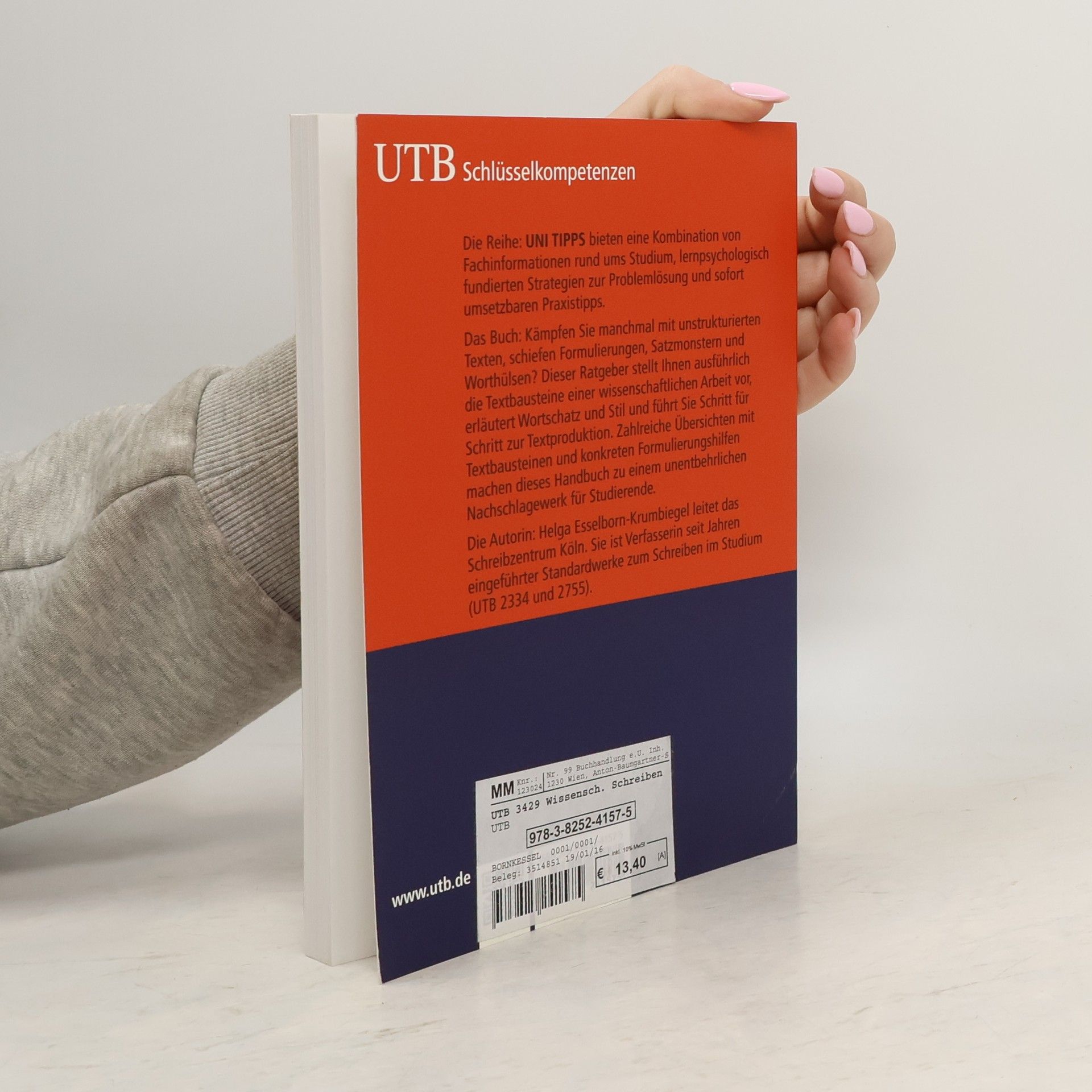 Die Reihe: UNI TIPPS bieten eine Kombination von Fachinformationen rund ums Studium, lernpsychologisch fundierten Strategien zur Problemlösung und sofort umsetzbaren Praxistipps. Das Buch: Kämpfen Sie manchmal mit unstrukturierten Texten, schiefen Formulierungen, Satzmonstern und Worthülsen? Dieser Ratgeber stellt Ihnen ausführlich die Textbausteine einer wissenschaftlichen Arbeit vor, erläutert Wortschatz und Stil und führt Sie Schritt für Schritt zur Textproduktion. Zahlreiche Übersichten mit Textbausteinen und konkreten Formulierungshilfen machen dieses Handbuch zu einem unentbehrlichen Nachschlagewerk für Studierende. Die Autorin: Helga Esselborn-Krumbiegel leitet das Schreibzentrum Köln. Sie ist Verfasserin seit Jahren eingeführter Standardwerke zum Schreiben im Studium (UTB 2334 und 2755).