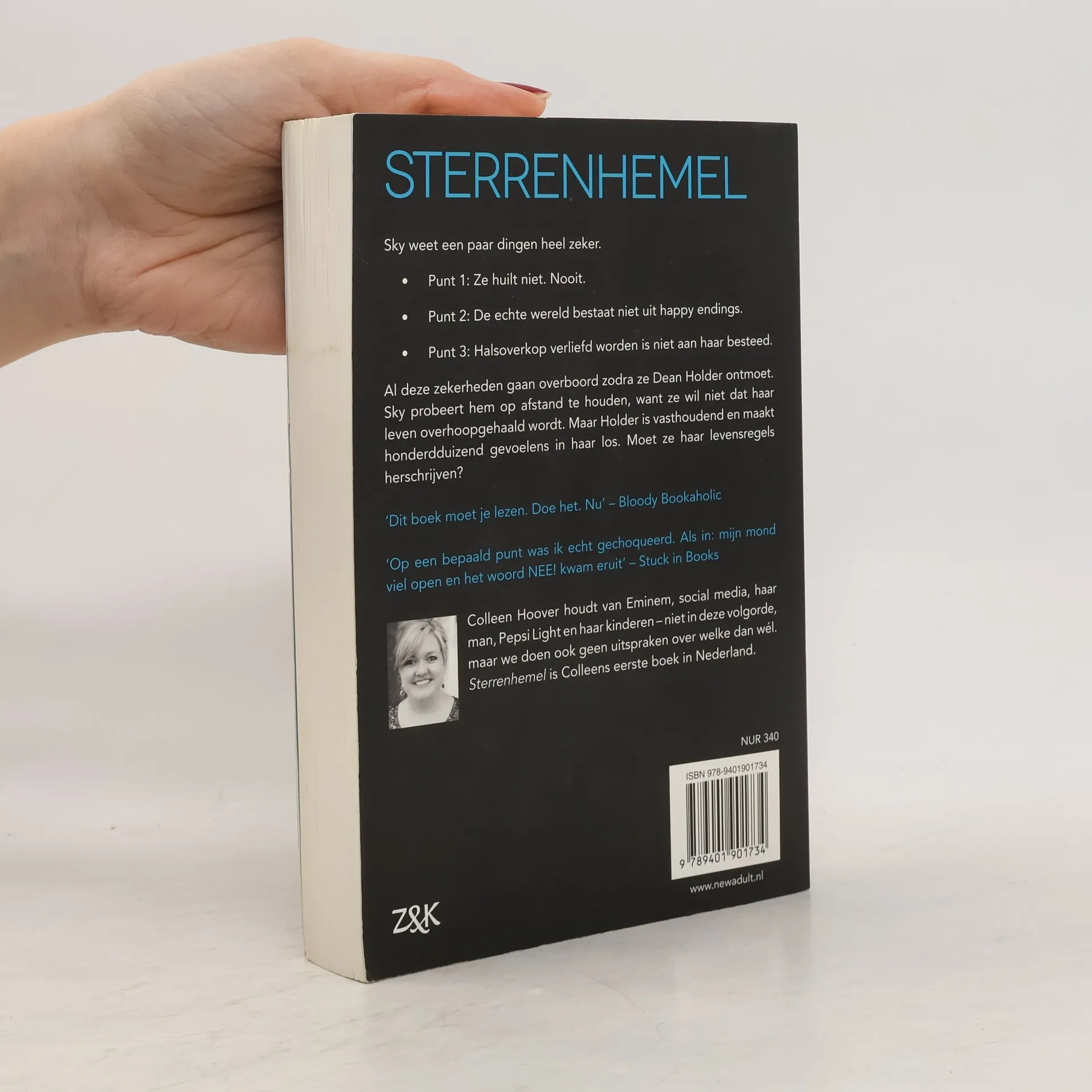 Sky, de hoofdpersoon in Sterrenhemel, weet een paar dingen heel zeker. Punt 1: ze huilt niet. Nooit. Punt 2: de echte wereld bestaat niet uit happy endings. Punt 3: halsoverkop verliefd worden is aan haar niet besteed. Totdat ze Dean Holder ontmoet, die honderdduizend gevoelens in haar losmaakt. Moet ze haar levensregels herschrijven? Schrijfster Colleen Hoover houdt van social media, haar man, cola light en haar kinderen - niet in deze volgorde, maar we doen ook geen uitspraken over welke dan wél.