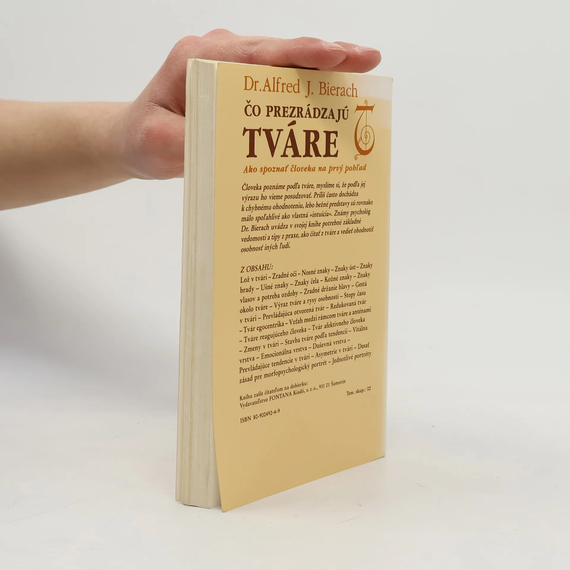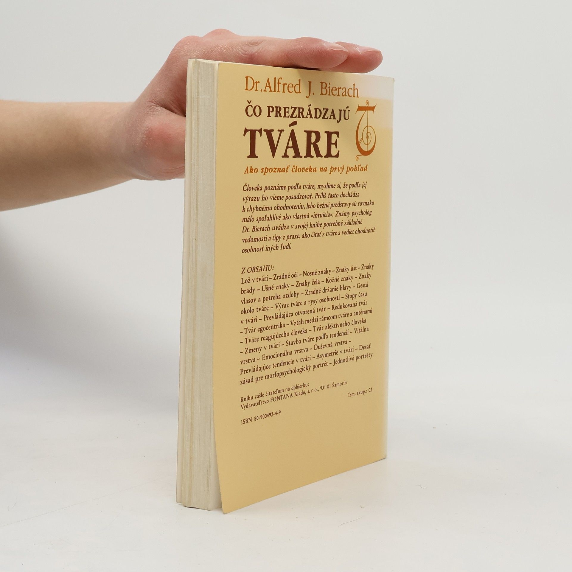 Ako spoznať človeka na prvý pohľad Človeka poznáme podľa tváre, myslíme si, že podľa jej výrazu ho vieme posudzovať. Príliš často dochádza k chybnému ohodnoteniu, lebo bežné predstavy sú rovnako málo spoľahlivé ako vlastná »intuícia«. Známy psychológ Dr. Bierach uvádza v svojej knihe potrebné základné vedomosti a tipy z praxe, ako čítať z tváre a vedieť ohodnotiť osobnosť iných ľudí. Z obsahu: Lož v tvári — Zradné oči — Nosné znaky — Znaky úst — Znaky brady — Ušné znaky — Znaky čela — Kožné znaky — Znaky vlasov a potreba ozdoby — Zradné držanie hlavy — Gestá okolo tváre — Výraz tváre a rysy osobnosti — Stopy času v tvári — Prevládajúca otvorená tvár — Redukovaná tvár — Tvár egocentrika — Vzťah medzi rámcom tváre a anténami — Tváre reagujúceho človeka — Tvár afektívneho človeka — Zmeny v tvári — Stavba tváre podľa tendencií — Vitálna vrstva — Emocionálna vrstva — Duševná vrstva — Prevládajúce tendencie v tvári — Asymetrie v tvári — Desať zásad pre morfopsychologický portrét — Jednotlivé portréty Prvé slovenské vydanie