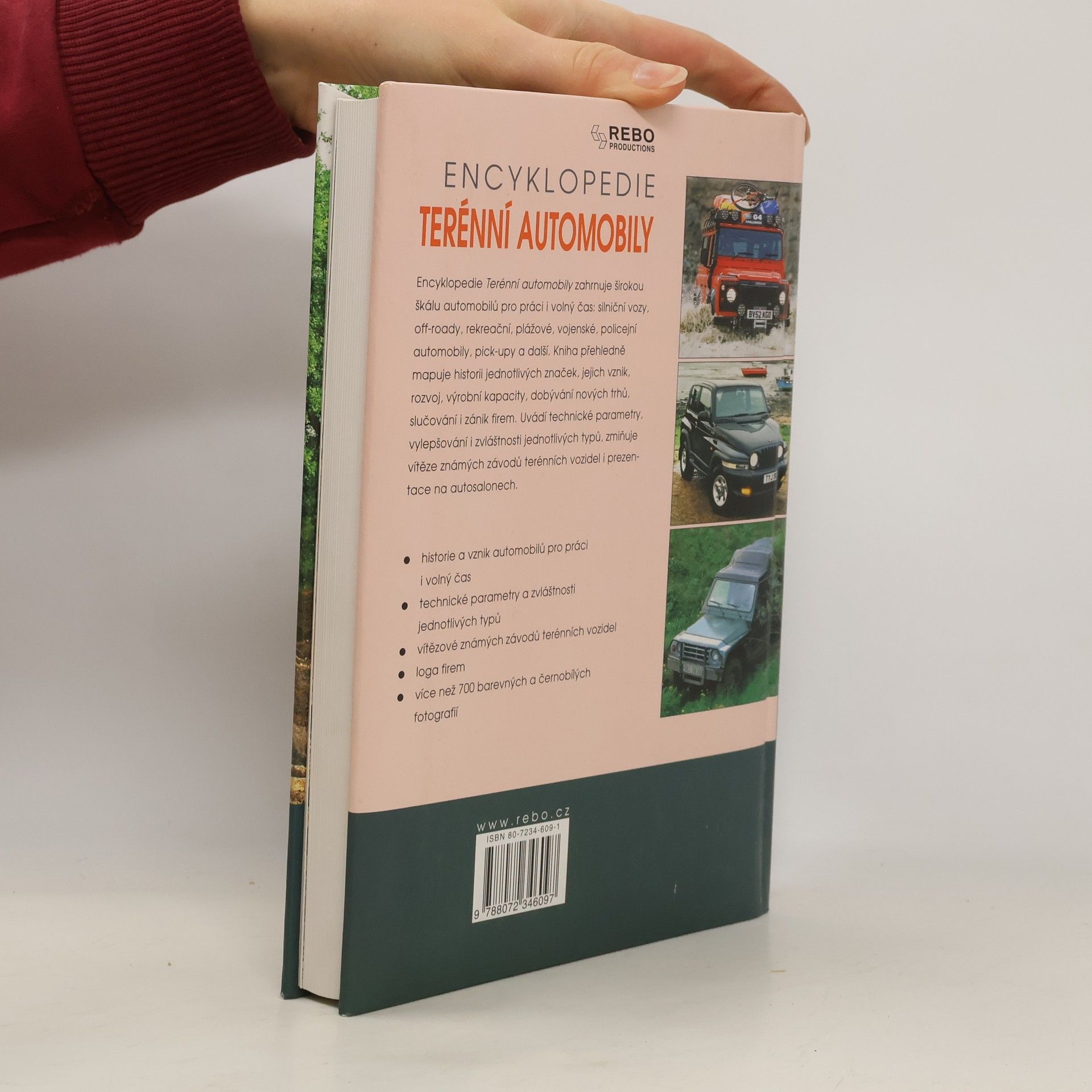 Encyklopedie Terénní automobily zahrnuje širokou škálu automobilů pro práci i volný čas: silniční vozy, off-roady, rekreační, plážové, vojenské, policejní automobily, pick-upy a další. Kniha přehledně mapuje historii jednotlivých značek, jejich vznik, rozvoj, výrobní kapacity, dobývání nových trhů, slučování i zánik firem. Uvádí technické parametry, vylepšování i zvláštnosti jednotlivých typů, zmiňuje vítěze známých závodů terénních vozidel i prezentace na autosalonech.
