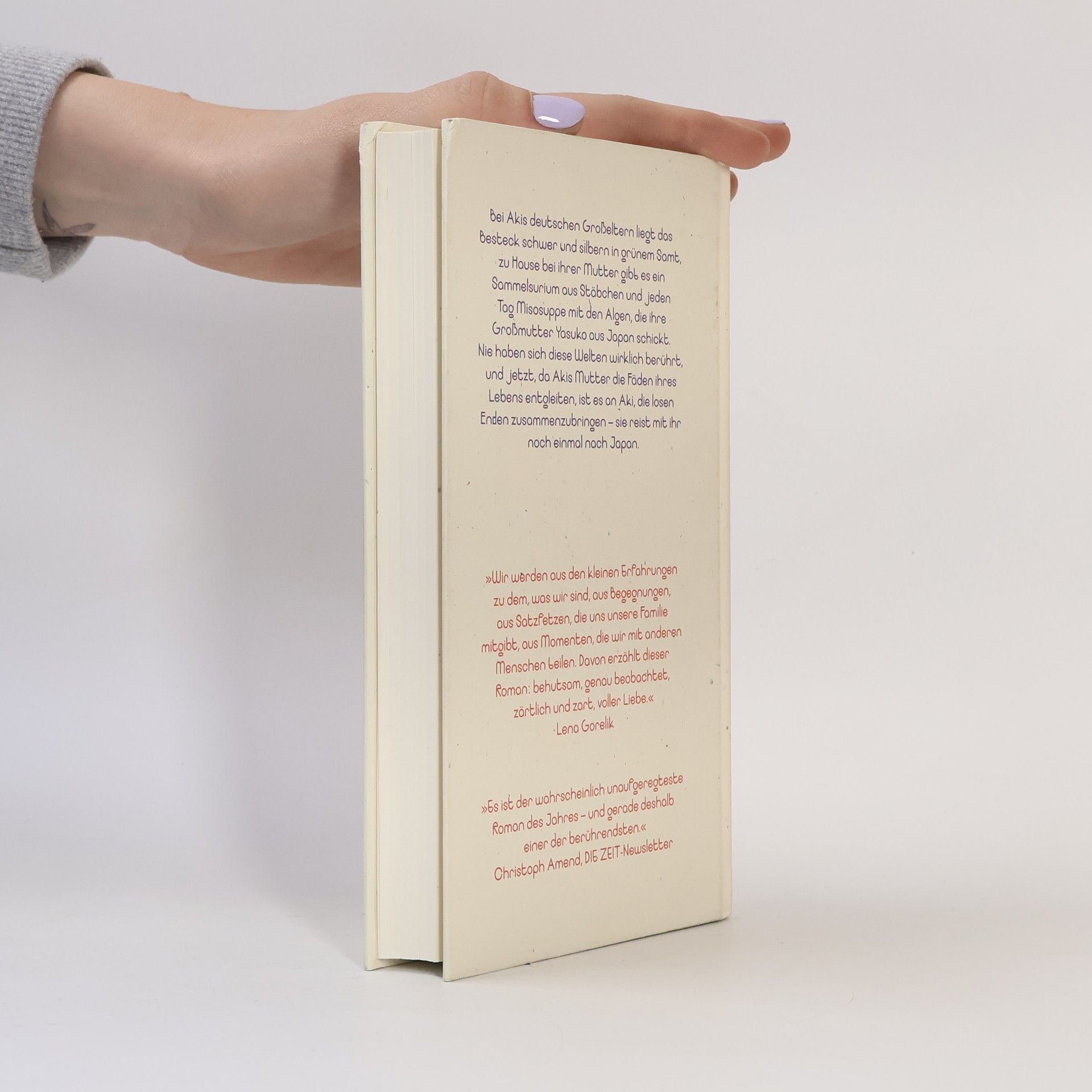 Als Aki erfährt, dass ihre Großmutter gestorben ist, bucht sie zwei Flüge. Ein letztes Mal will sie ihre Mutter zu ihrer Familie in Japan bringen, auch wenn sie weiß, wie riskant es ist, einen dementen Menschen aus der gewohnten Umgebung zu reißen. Und wirklich hat sie Keiko noch nie so verloren erlebt wie in der ersten Nacht im Hotel. Doch dann sitzen sie beim Essen im alten Elternhaus, und plötzlich spricht sie, die so still geworden ist, fröhlich und klar für sich selbst. Erst auf dieser Reise erkennt Aki in ihrer Mutter die mutige und lebenshungrige Frau, die sie einmal war, bevor sich in Deutschland diese große, für Aki so bedrohliche Müdigkeit über sie legte. Mit sanfter Klarheit lässt Yuko Kuhn die faszinierende Geschichte einer deutsch-japanischen Familie entstehen, die zwischen den Kulturen verloren geht und sich neu findet.