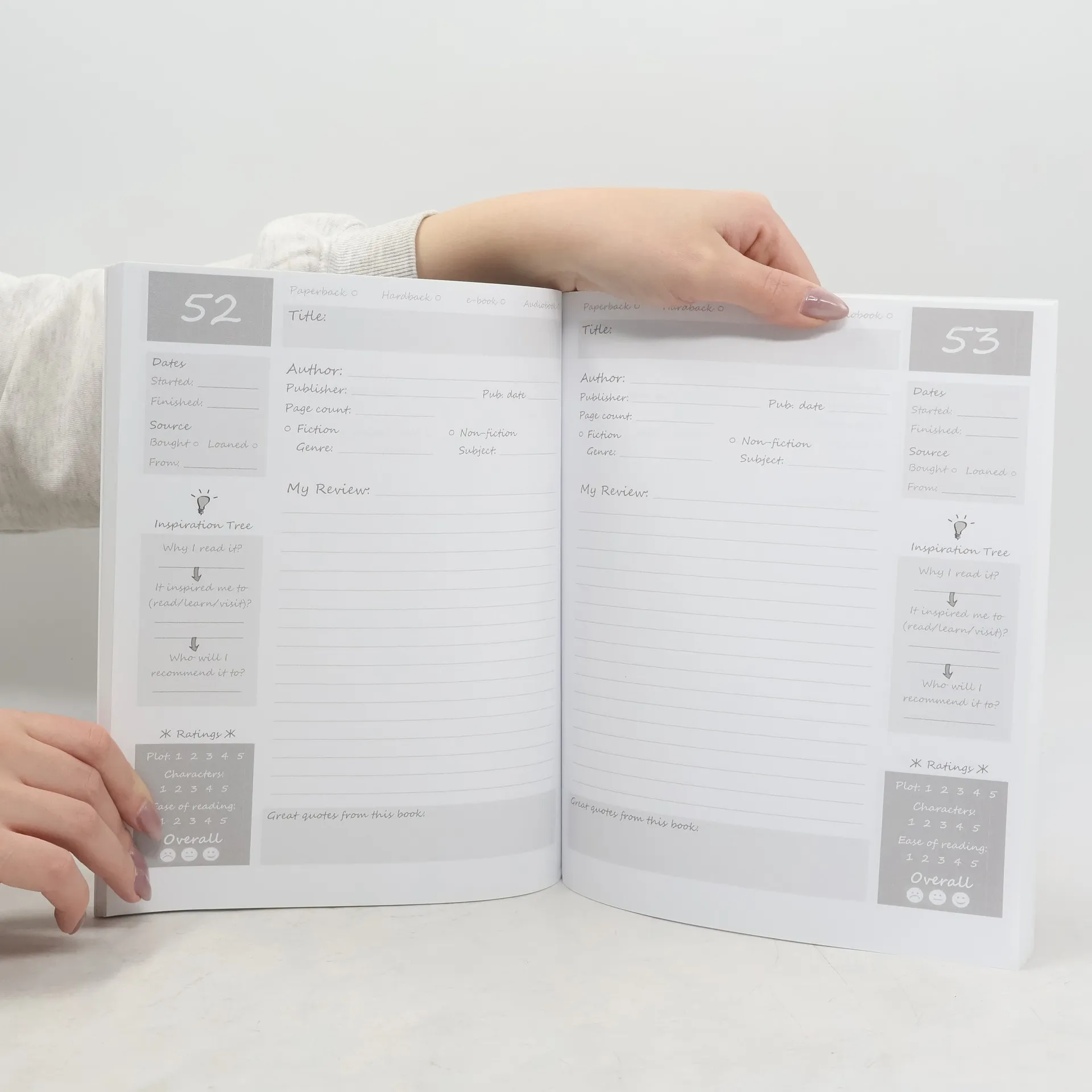 This large 8" x 10" softback reading log/journal features a cover with printed images of wood and antique books, along with an inspirational quote on the back. Inside, it offers one hundred spacious record pages designed for comprehensive book tracking. Users can log the title, author, publishing details, page count, start and finish dates, book format, source, genre, and personal thoughts in an Inspiration Tree. There's also space for ratings on plot, character development, ease of reading, and an overall review score, along with memorable quotes. Additional features include a loan record sheet, a tick list of the top 100 voted fiction books, and a notes page for new authors and reading resources. The front includes a blank personalized contents table for categorizing reviews, making it easy to find entries later. The thick white paper minimizes ink bleed-through, ensuring durability. The cover is a tough matte paperback with the quote "Reading is to the mind what exercise is to the body." The secure professional trade paperback binding guarantees longevity. Similar products from the same publisher offer various cover designs while maintaining the same interior layout. Customers have praised the quality and design, highlighting the beautiful artwork and practical size for jotting down ideas.